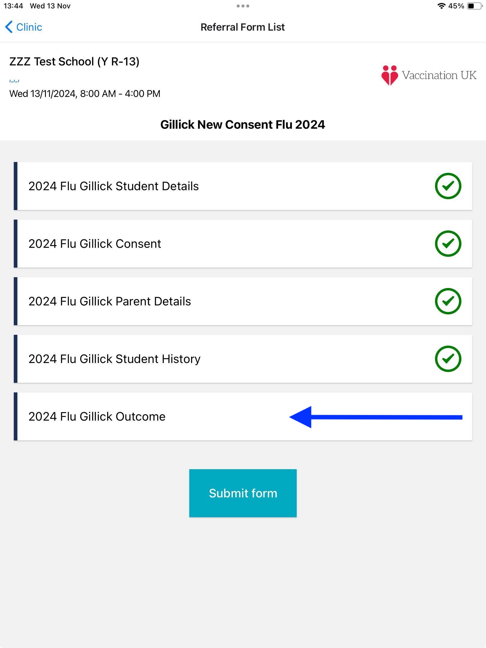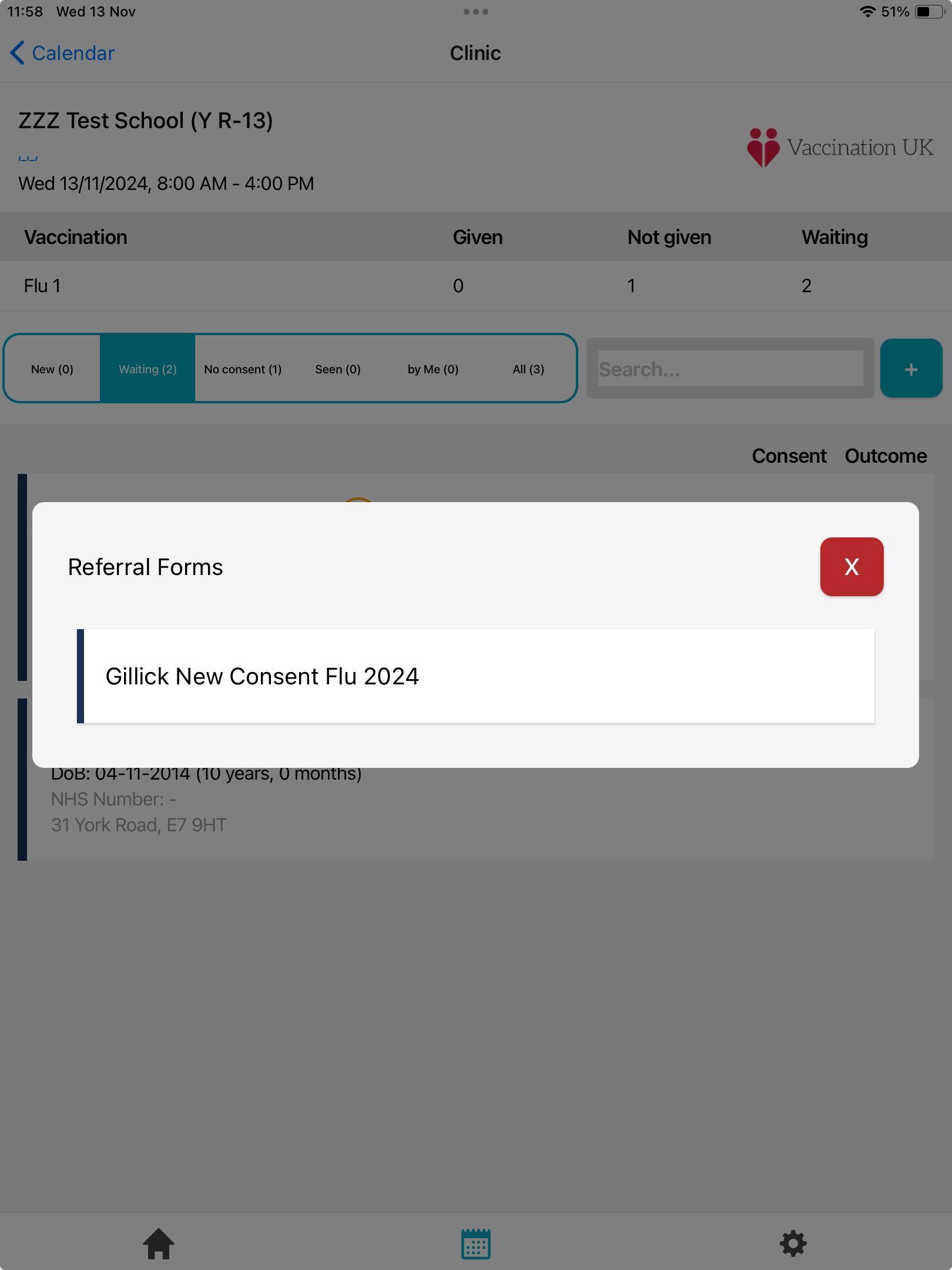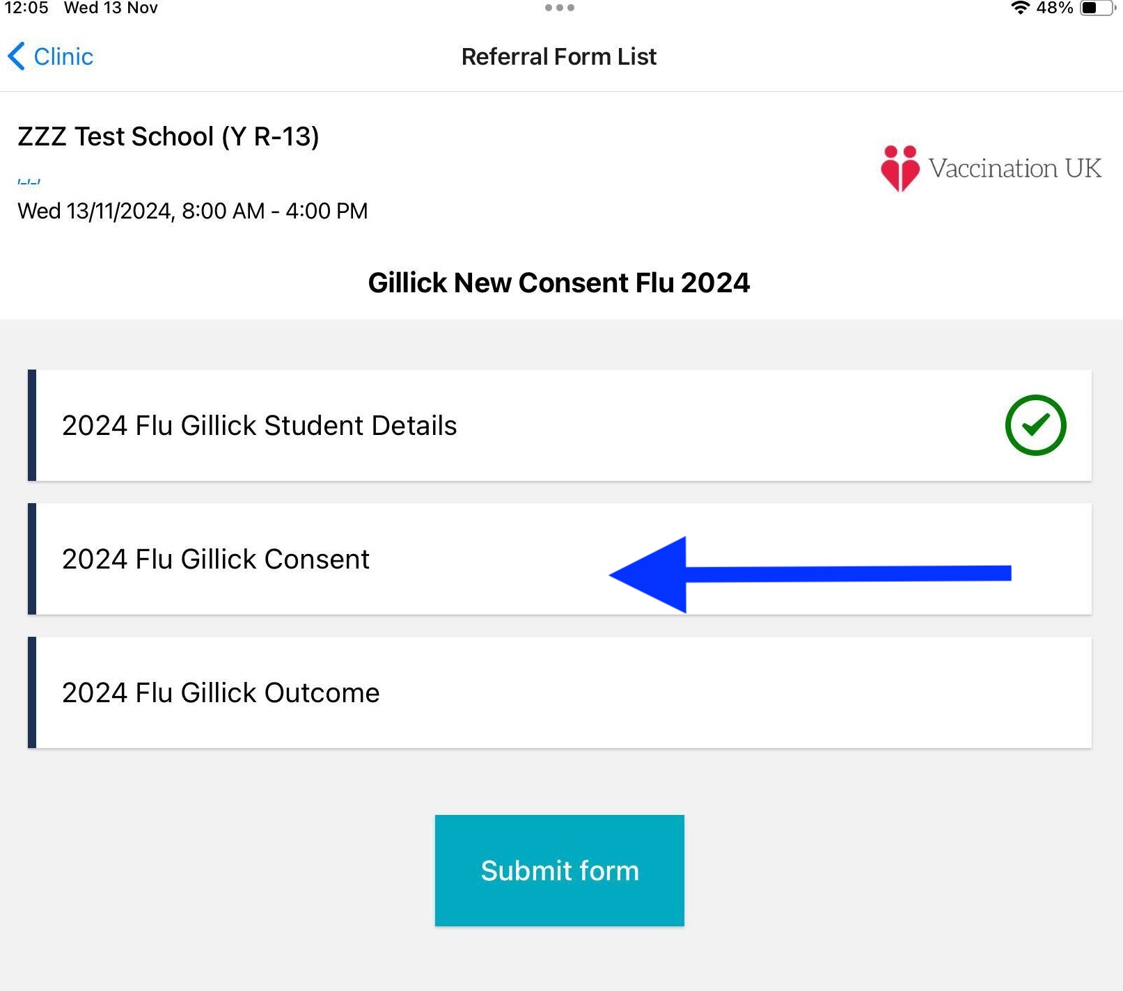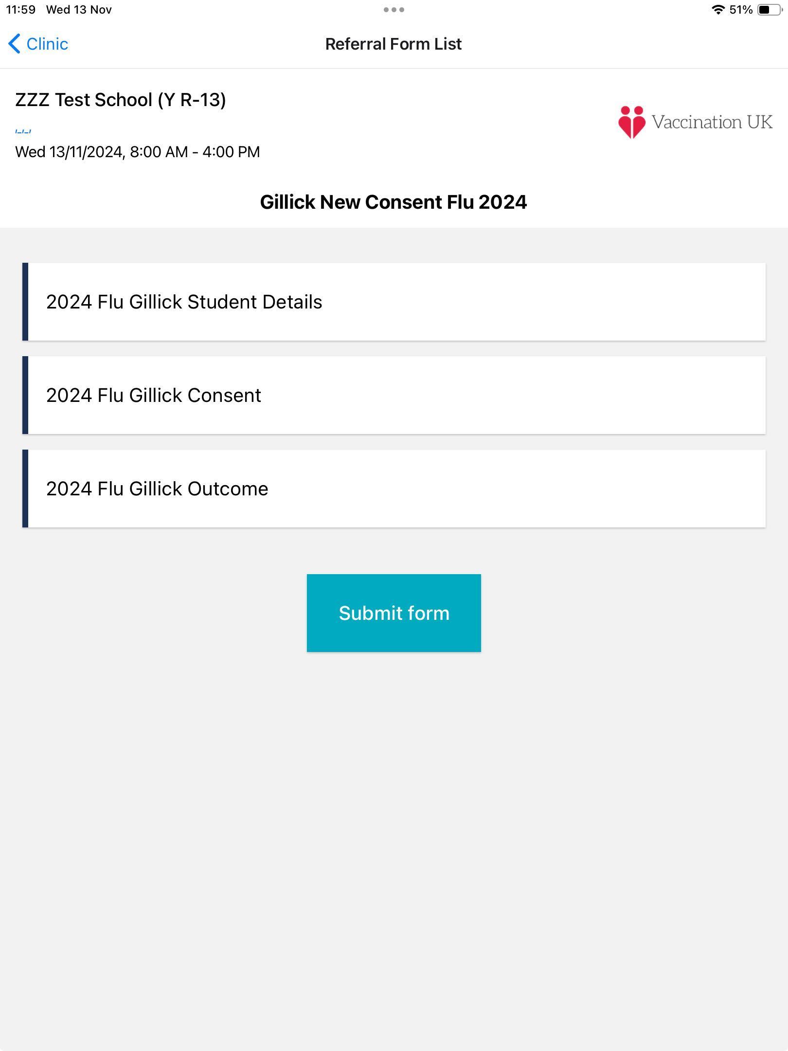 Log in to your mobile device and choose your school clinic. Gillick competence functionality is available for Flu 24/25 and can be rolled out across other immunisation programmes as required by the customer.