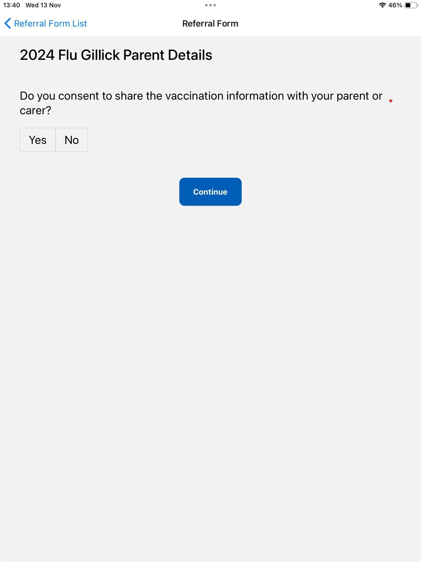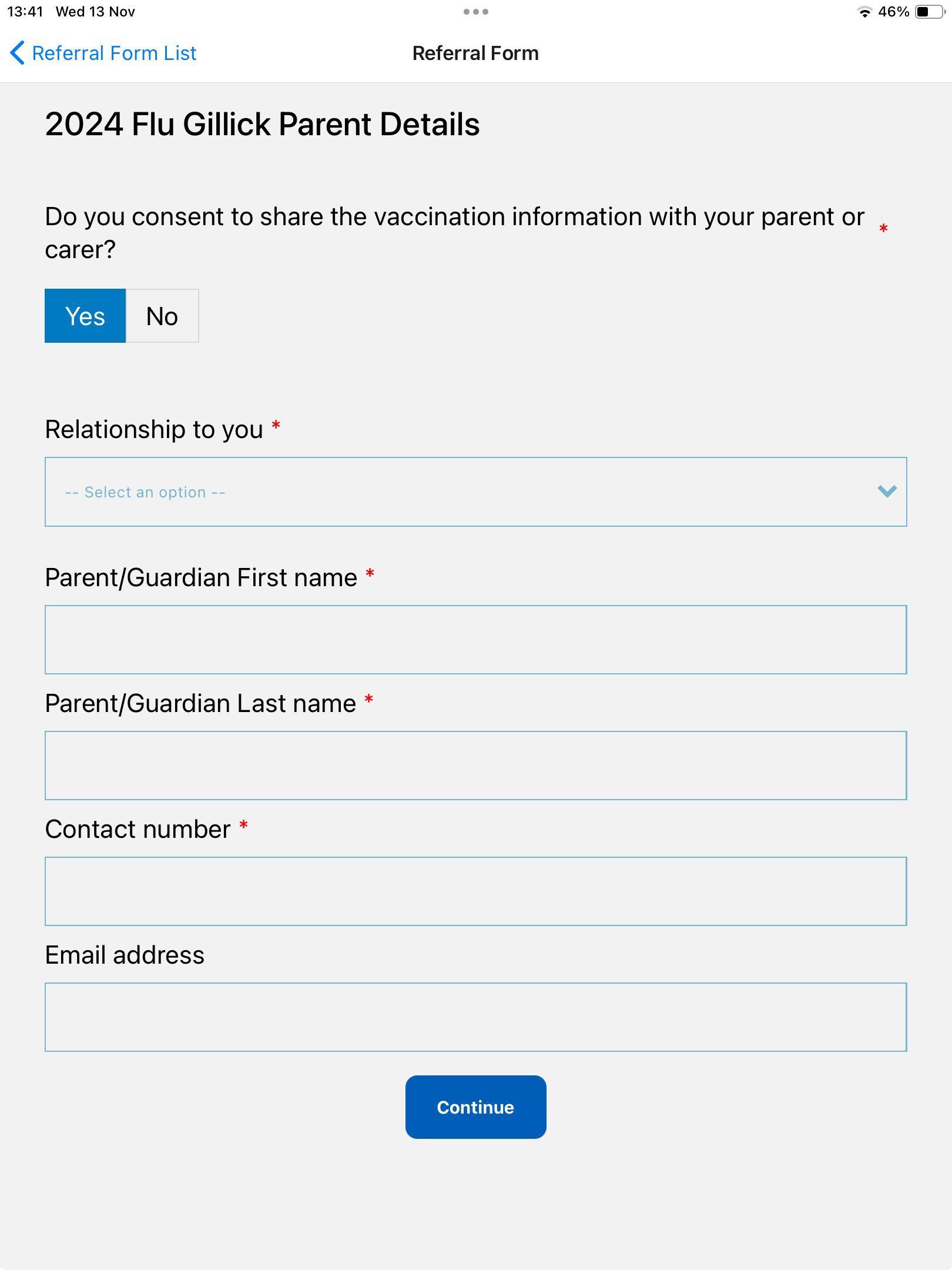 If the student says “No”, then press "Continue" and proceed to the next section of the Gillick competency form. If the student says “yes”, you will be asked to complete the parent's details and then select "Continue".