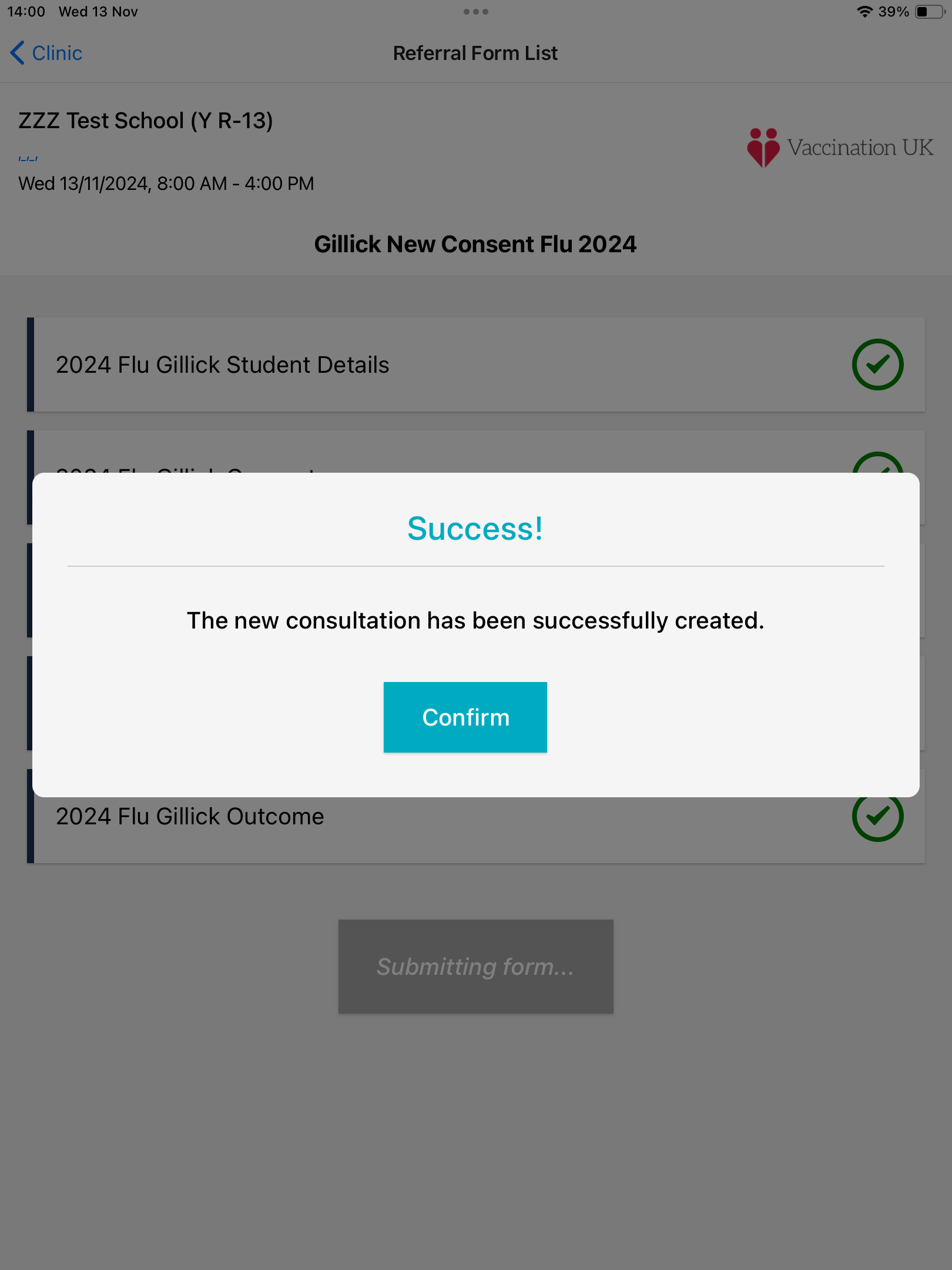 A further pop-up window stating "Success" appears, confirming your Gillick competency form has been submitted. Select Confirm.