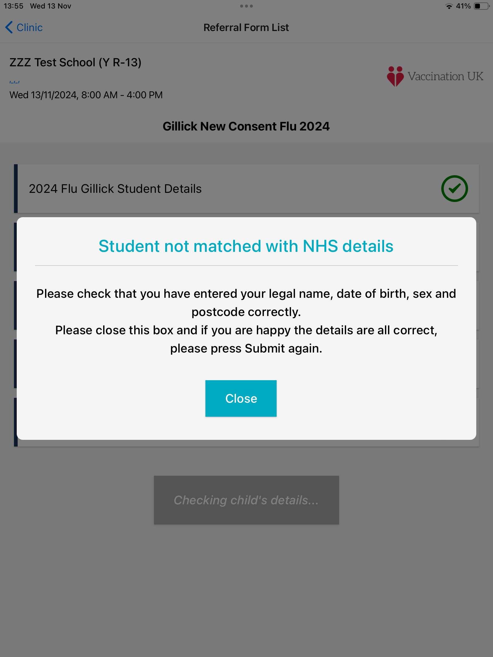 All Gillick competency consents submitted are checked using RIVIAM NHS Mini Spine integration. If the demographics on the Gillick competency form match the NHS Mini Spine, RIVIAM will record the student's NHS number.