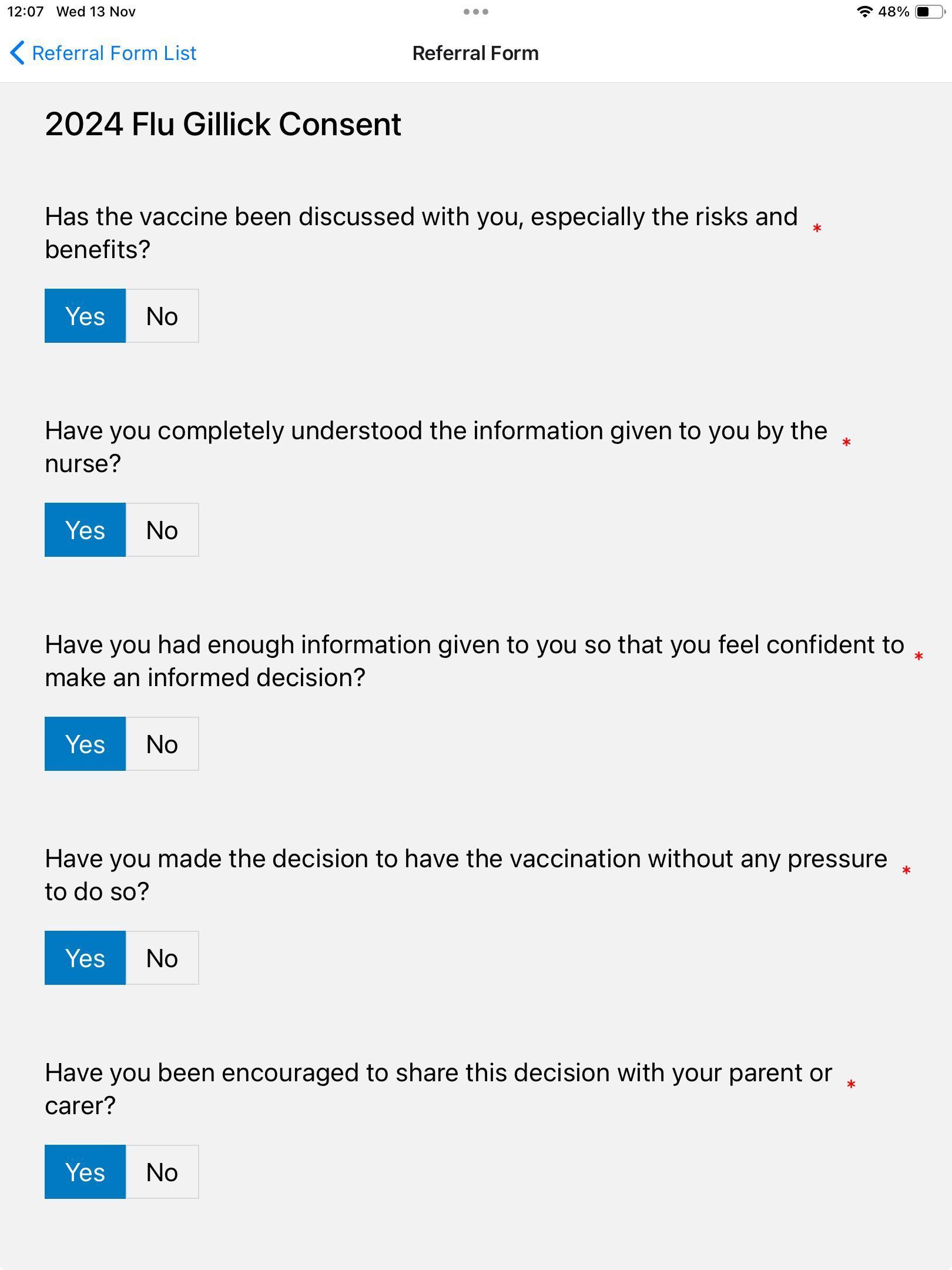 The Gillick competency assessment questions will load. Please select yes or no, as appropriate.