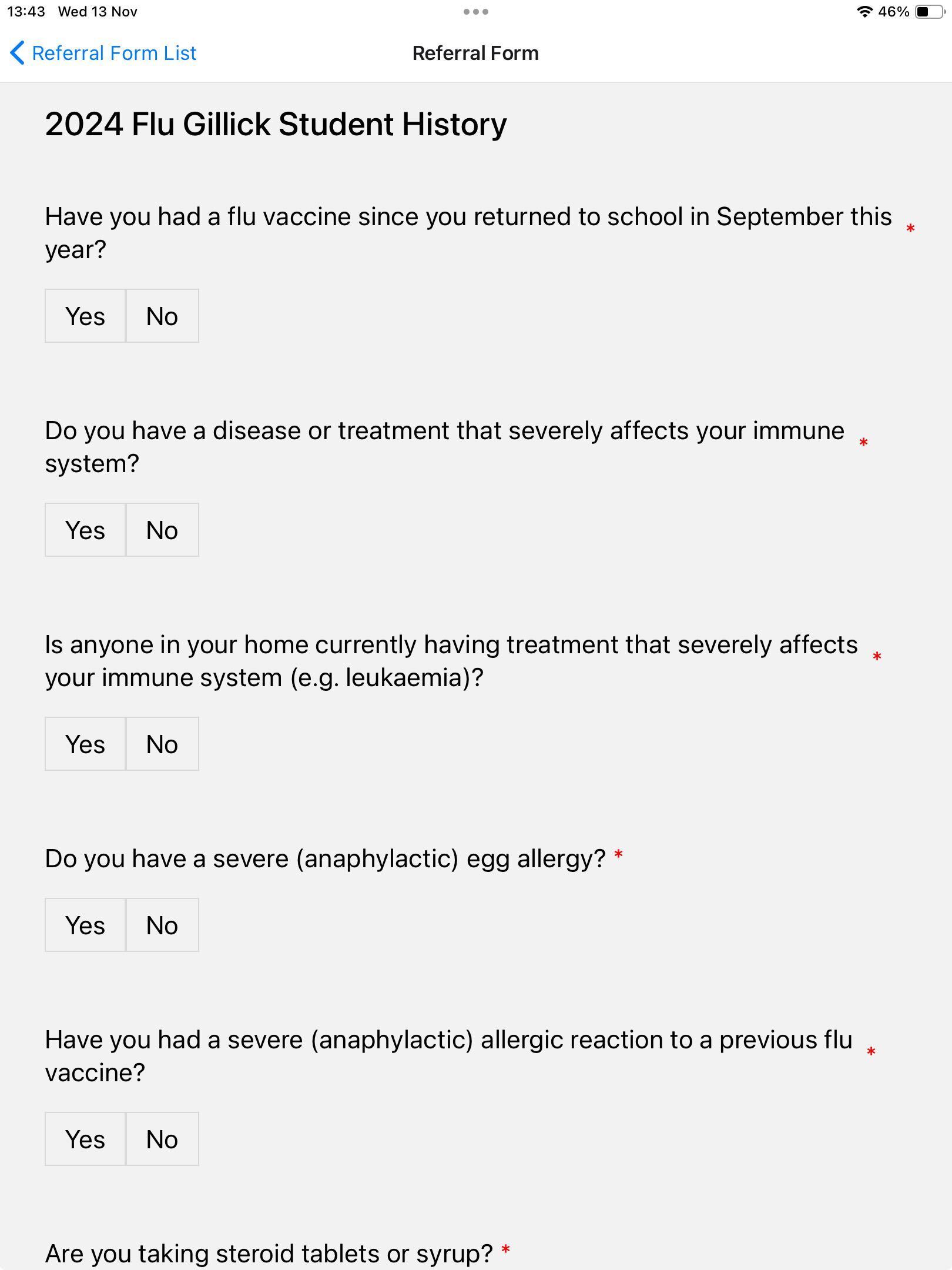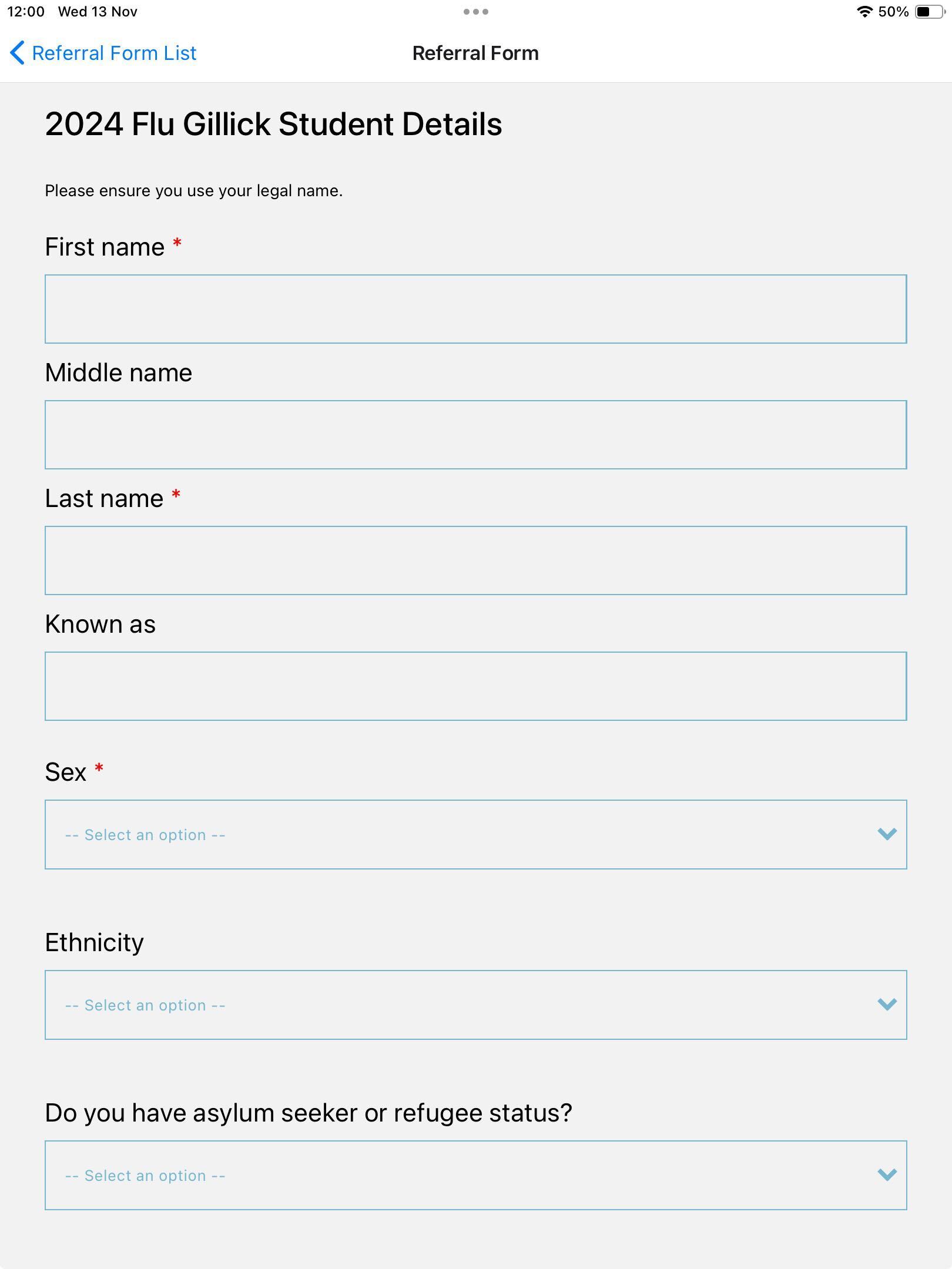 Designed to streamline the Gillick competency process, the Gillick competency form is intended for scenarios where a student presents for vaccination without existing parental consent. Clinicians can record the consent and the consultation outcome using the same form.