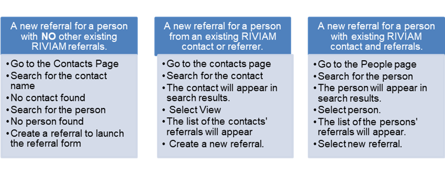 There are several ways to create a new referral whilst logged in to RIVIAM Workflow. The diagram below gives instructions on creating a new referral depending on whether the person or the Contact is already known to RIVIAM.