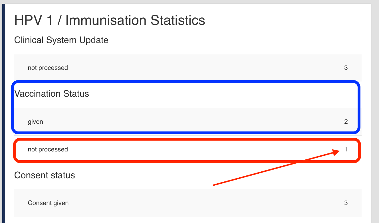 For example, in the screenshot below, you can see that two children have been recorded as vaccinated or "given" by the system, but one child is still in the "not processed" vaccination status, so he has not been recorded as vaccinated.