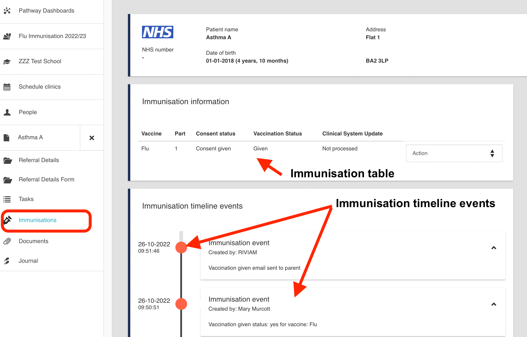 Under the ‘Immunisations’ tab on RIVIAM, you will see the updated vaccination outcome under the timeline events and the Immunisation table.