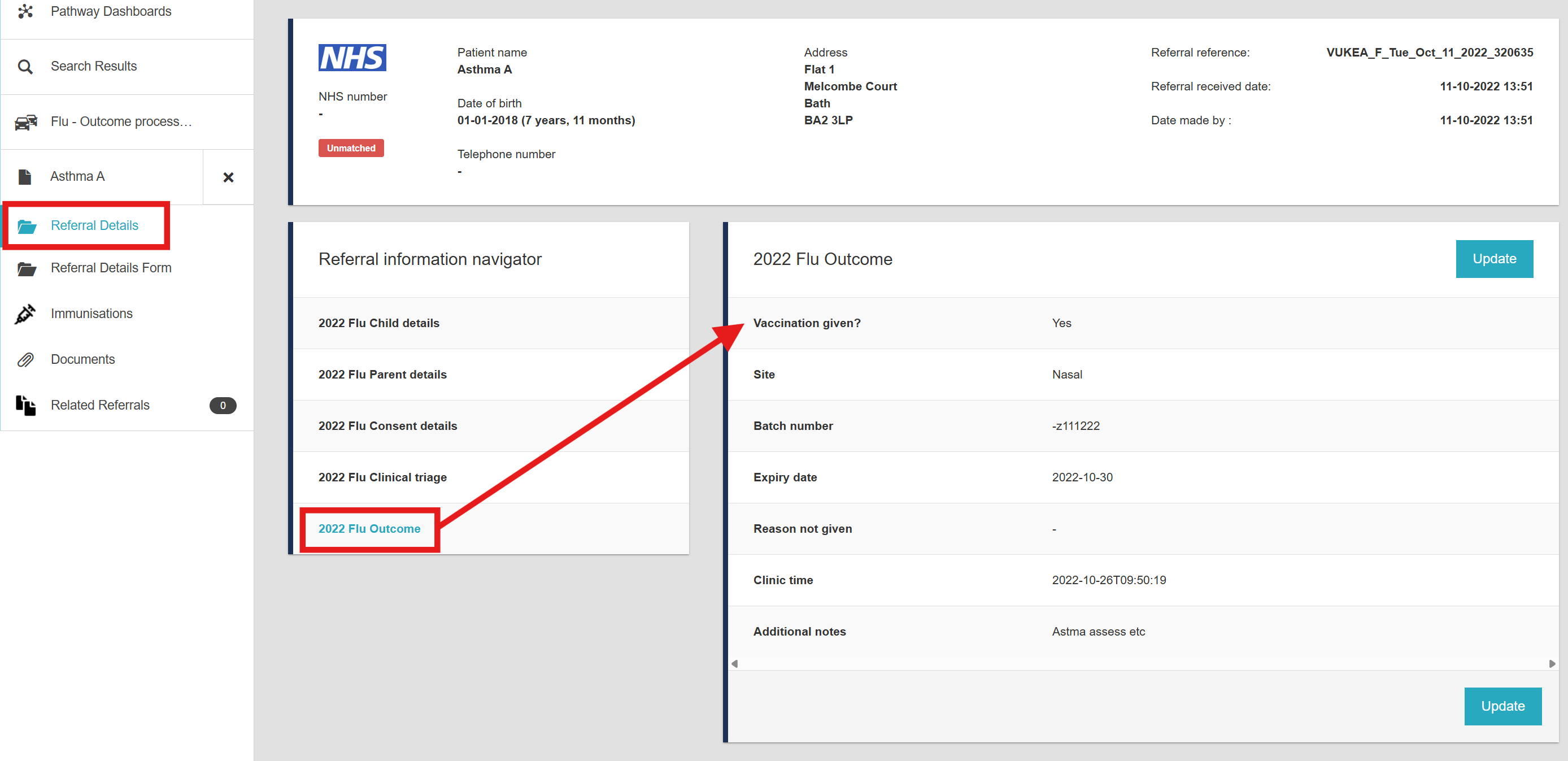 Under the ‘Referral Details’ tab on RIVIAM, you can also see the outcome data submitted from the mobile app (if using a spreadsheet, this won't be visible in this section). This will appear under the outcome section of the form, as shown below.
