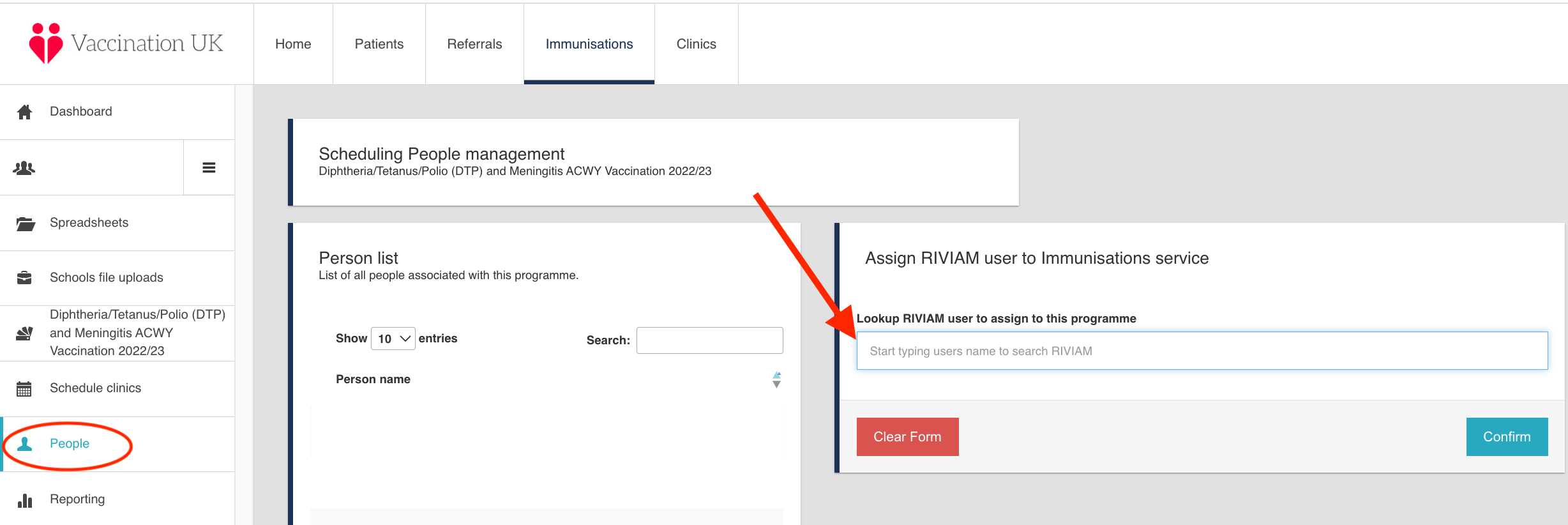 RIVIAM provides a scheduling service that allows clinicians to be added to schools & clinics. To do this, the clinician must be assigned to the correct immunisation programme in RIVIAM.