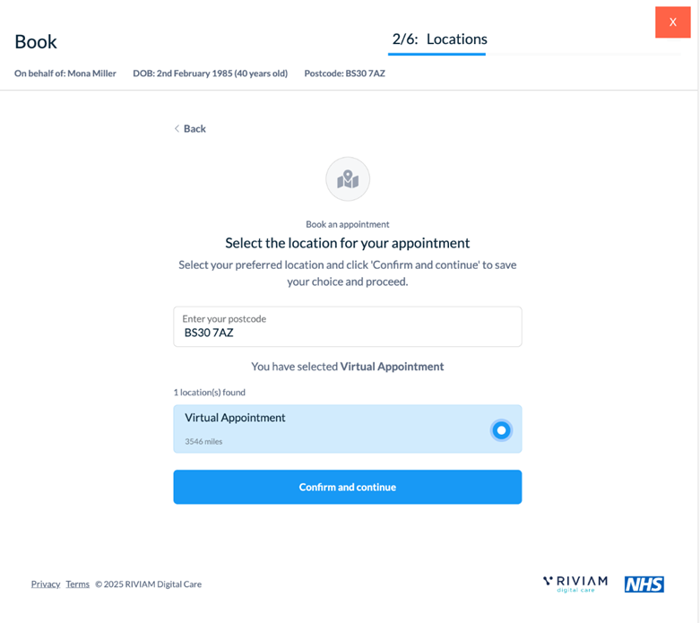 Select the location of the appointment as appropriate.