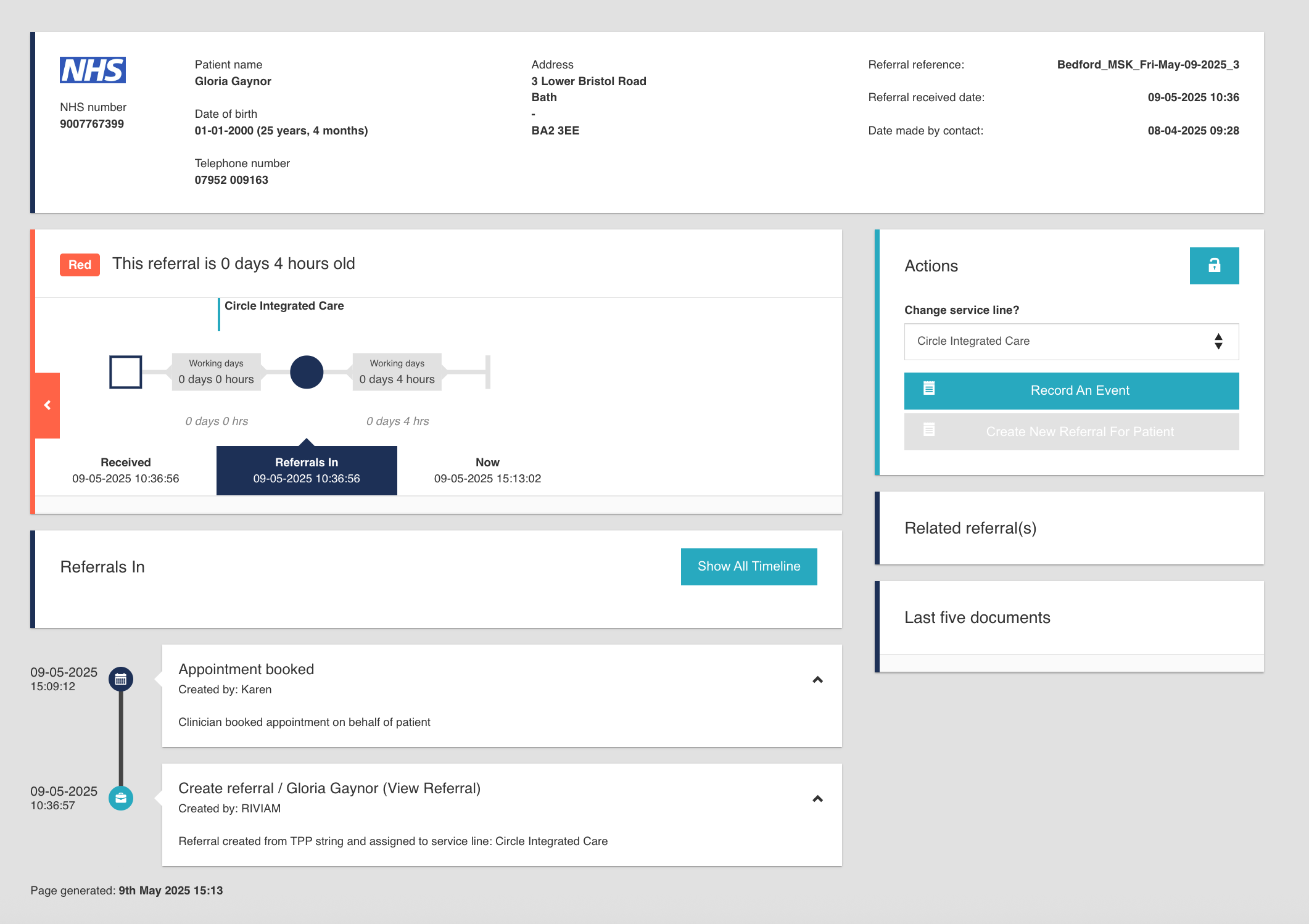 When you open the patient's record, you will see that a timeline event has been created, documenting the date, time, and username of the person who completed the action. If the patient books an appointment via the Patient Portal, a timeline event is also generated.
