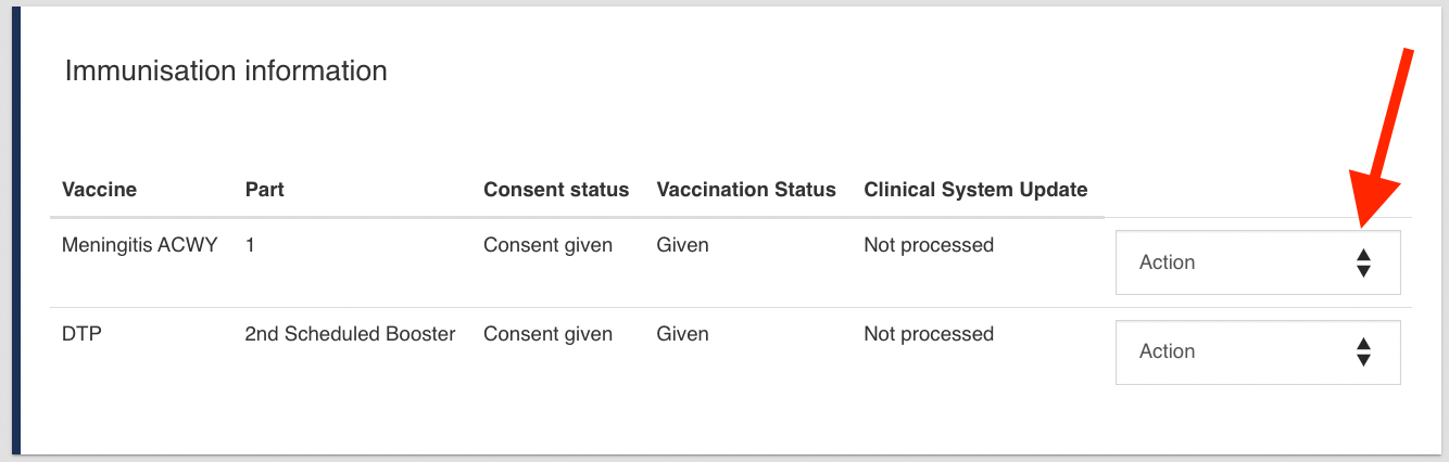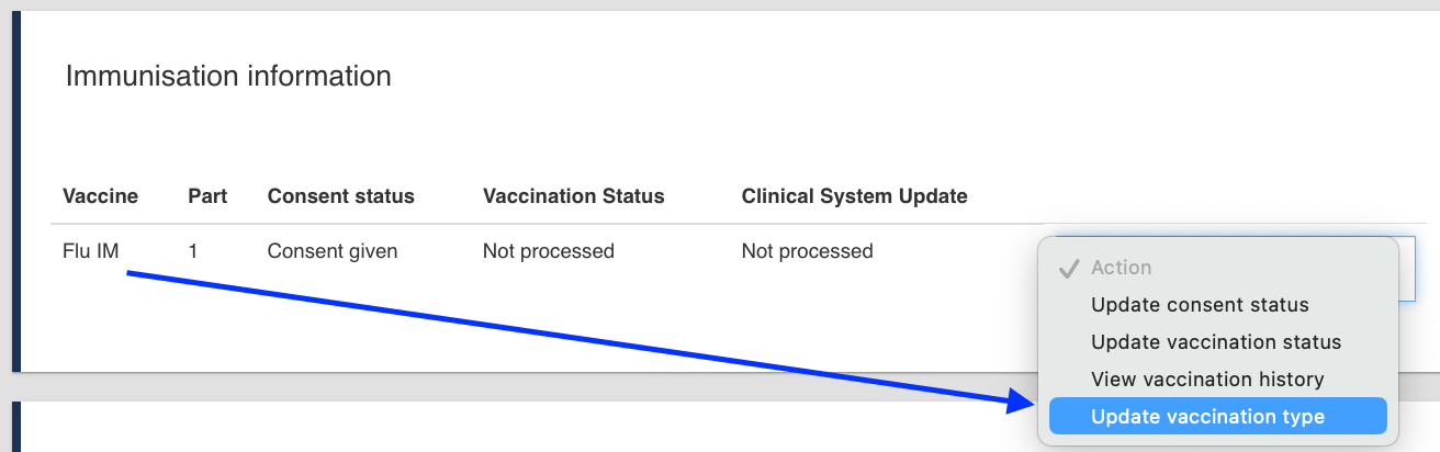 If, for any reason, the vaccine type needs to be changed (Nasal to Injectable or vice versa), the immunisation team can do this by selecting the Immunisation tab (with syringe symbol).