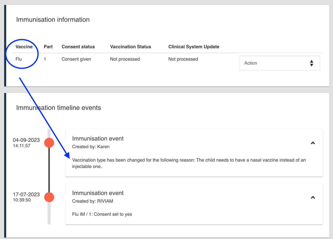 You will see that the vaccine type on the vaccination record has changed from Flu nasal as required. The child will not appear in the required Flu clinic list.