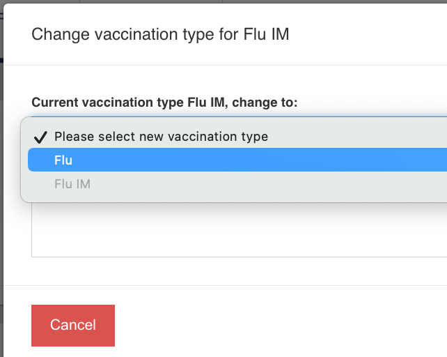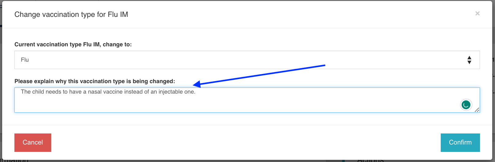 We recommend that the user add a reason for this change. The change of vaccine type, along with whatever you filled in the explanation section, will appear on the iPad for your colleagues at the clinic to see. Select 'Confirm'.