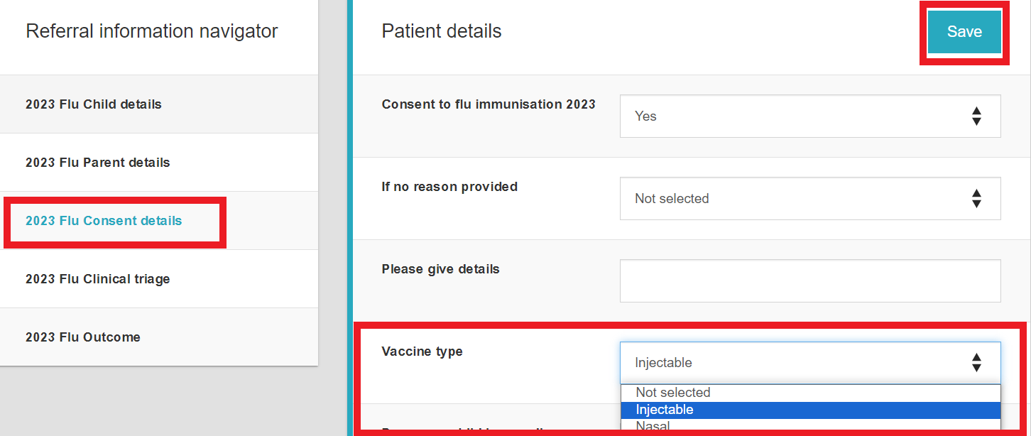 When the parent or carer submits an eConsent, they have the option to choose between a Nasal or an Injectable vaccine.