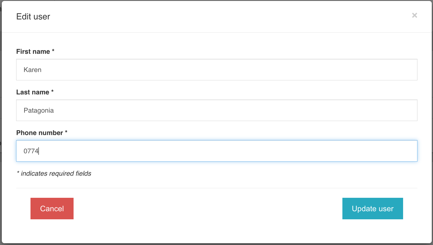 A pop-up window will appear where it is possible to change the first name, last name and telephone number: