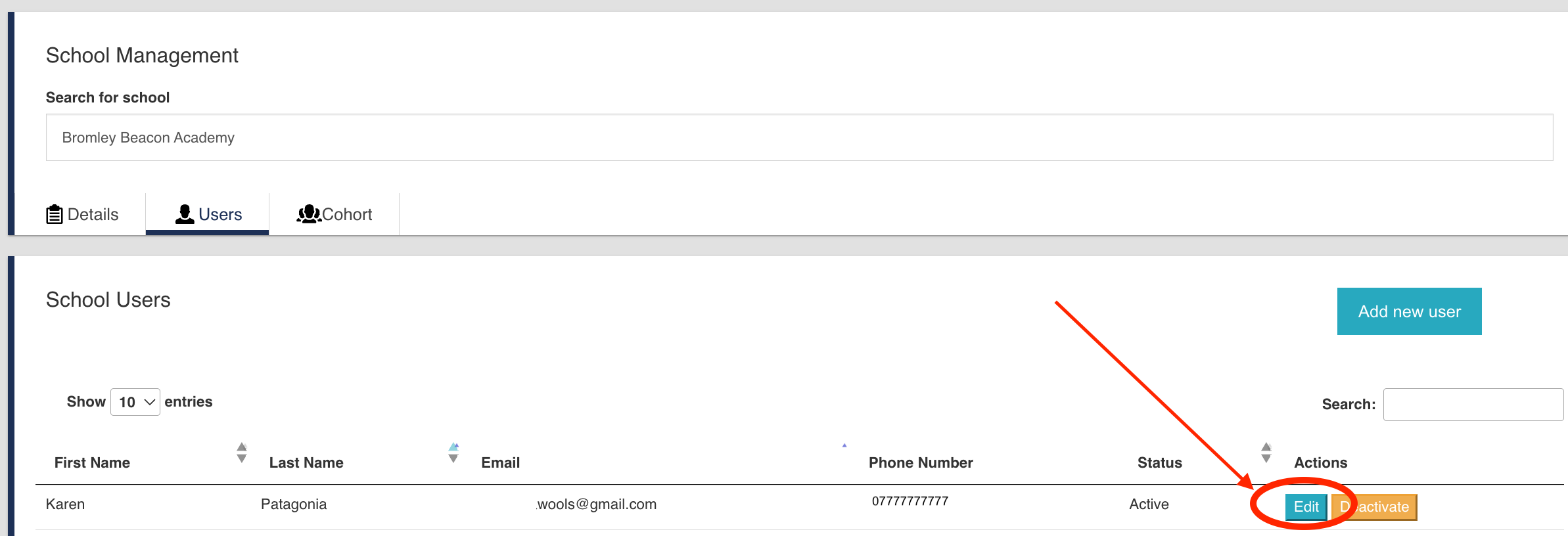 If the School Immunisation team needs to change any user details, select the user they need to amend and select "Edit":