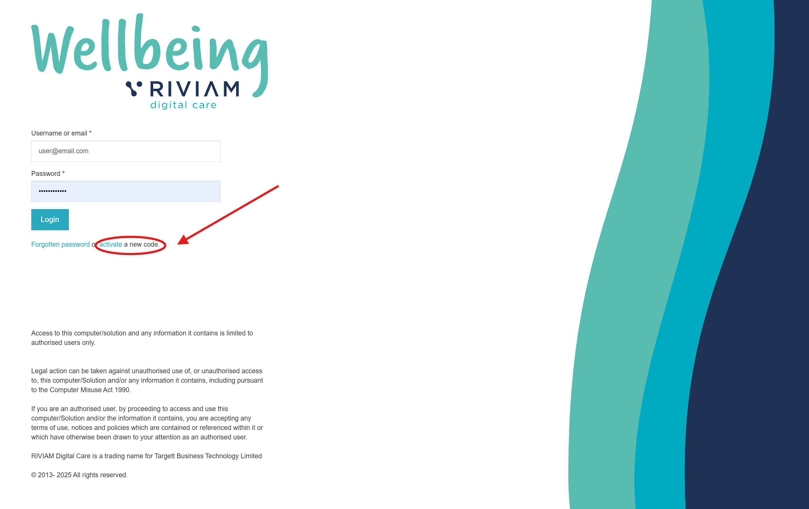 Upon receiving this, please load the RIVIAM Web log-in page and select Activate a new code under the login button.