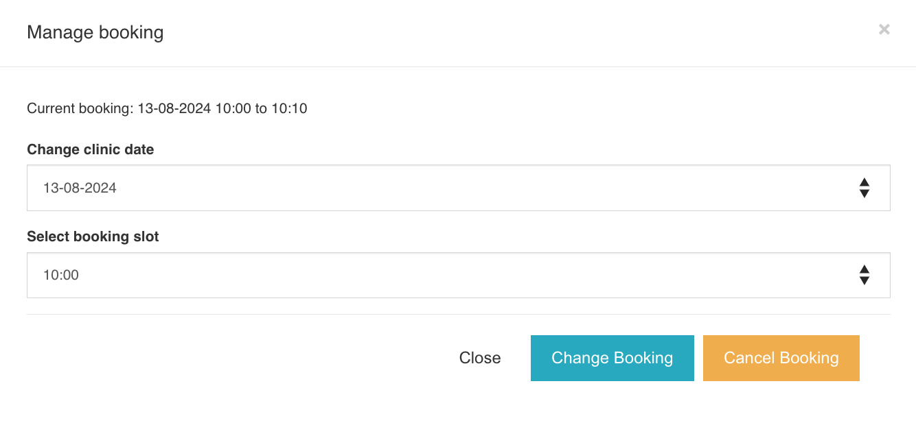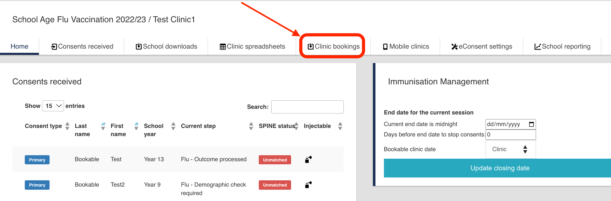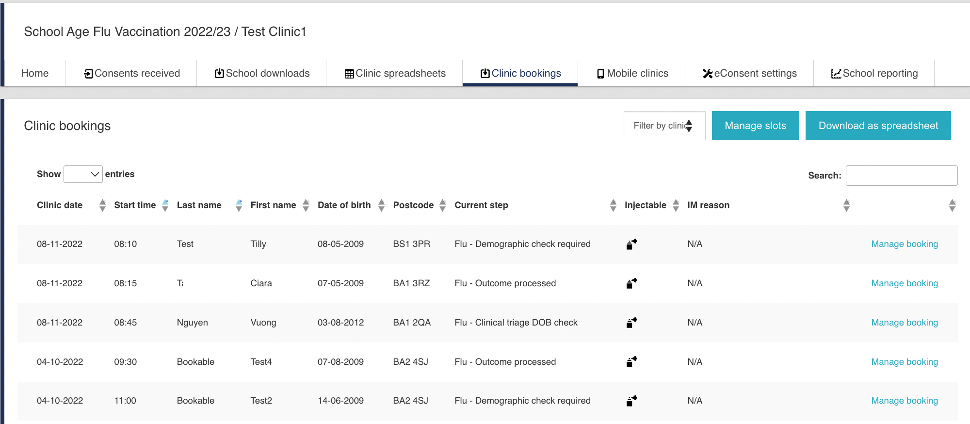 If you click on the Clinic bookings tab, you will see a list of all bookings for that clinic.