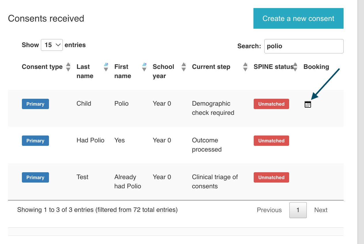 Please note: You can see where individual consents in a school have bookings in a catch-up community clinic, as they will display a booking calendar icon next to them.