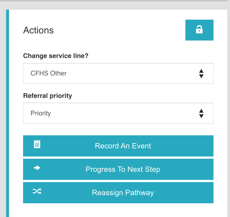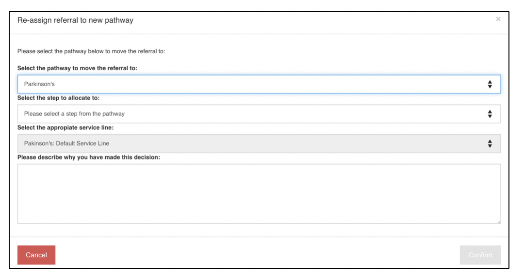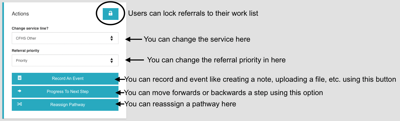If you decide that a referral needs to move to a different pathway, you can do this by clicking the "Reassign Pathway" button on the right-hand side of the referral dashboard (under "Actions").