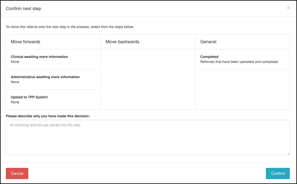 Progressing to the next step involves clicking the relevant step under "Move forwards" as shown below. For example, the referral could move to Clinical Awaiting more information, Upload to TPP Systm1 or Completed as shown below (to note, these steps are configurable).
