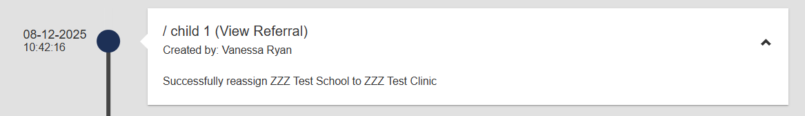 The change of school will be recorded as a timeline event, stating which school the consent has been allocated to and from.