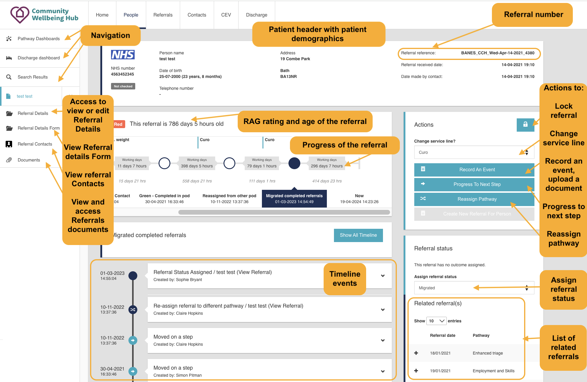 <br> This guide will provide users a comprehensive overview of patient information and actions you can take to update or amend records. The referral navigator dashboard displays the patient's demographics and referral details. Lock or ...