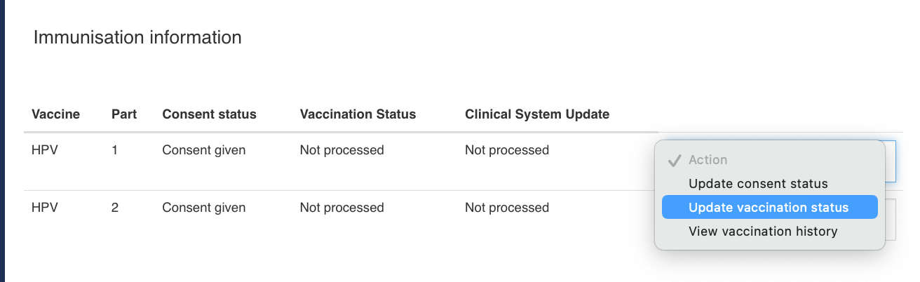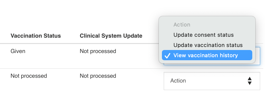 Go to the "Consents received" tab and select the record needed. You will see three horizontal lines. Select the option "Update Vaccination Status" from the drop-down menu and complete the form with the vaccination details.