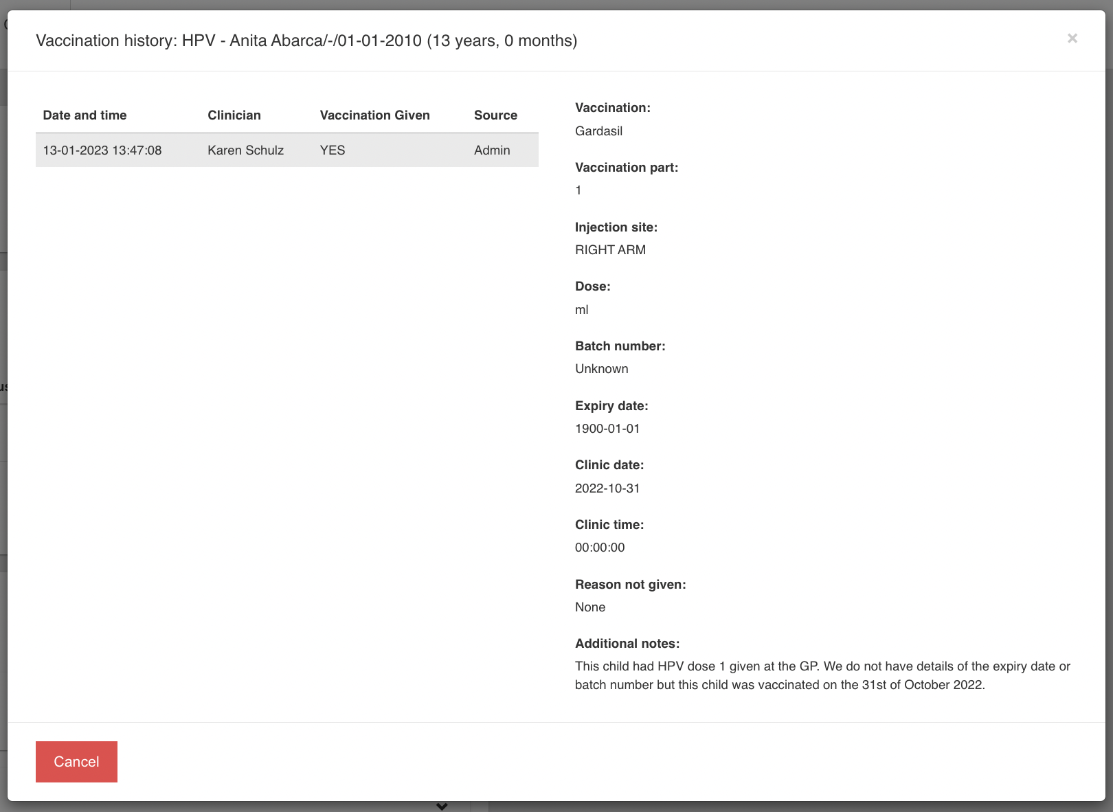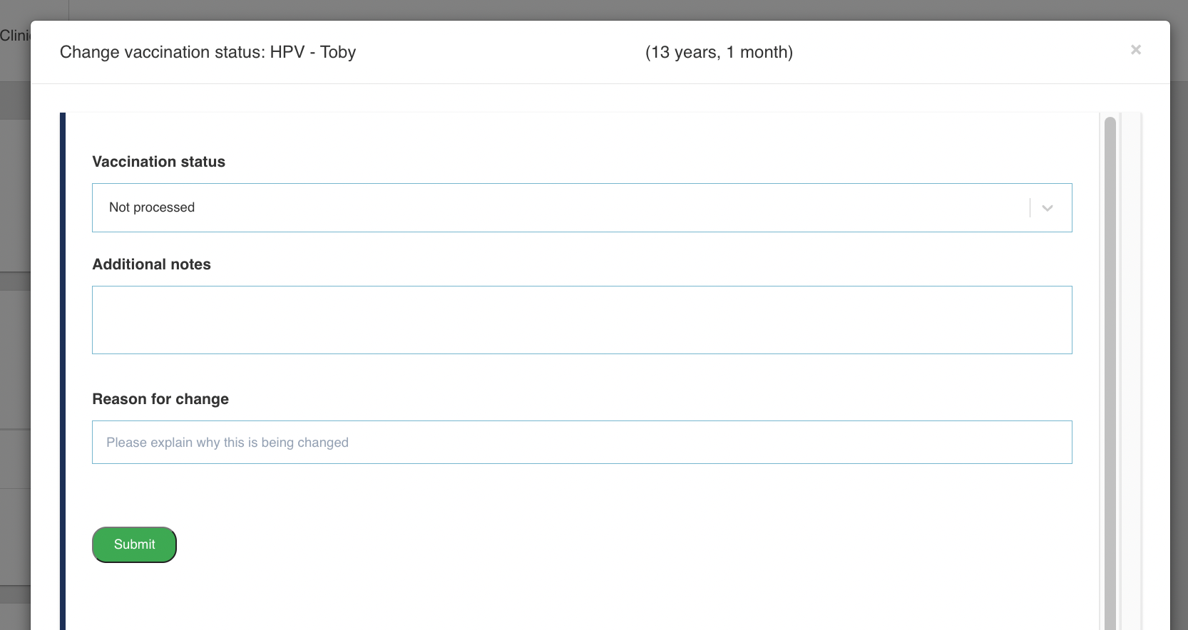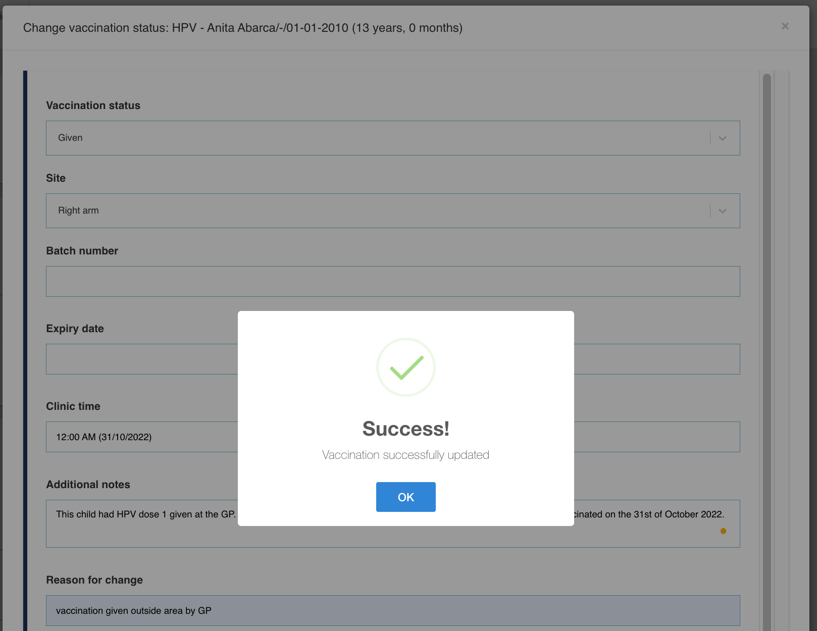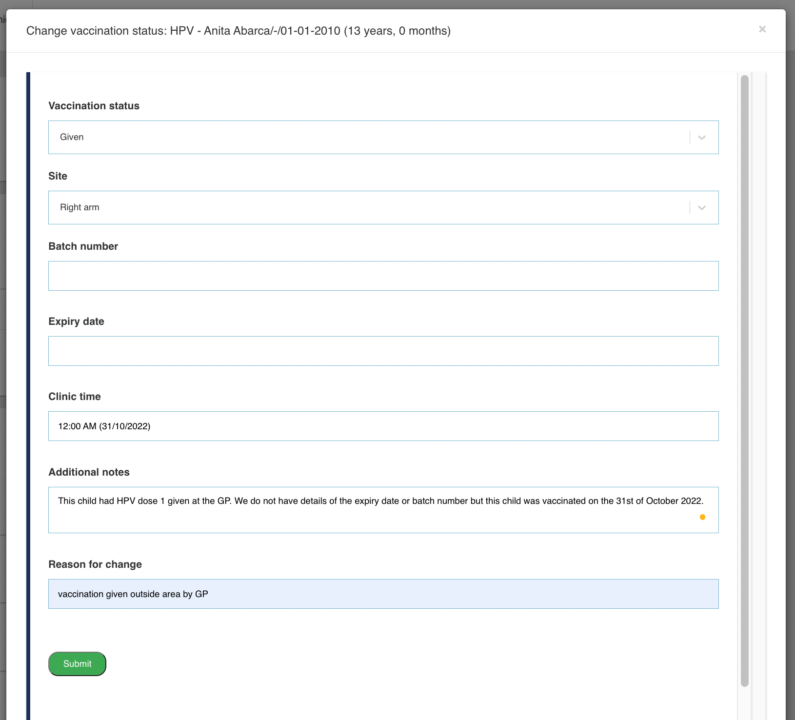 IMPORTANT– Please ensure you add additional notes and the reason for the change, as this will be recorded in the vaccination history, timeline events and patient referral details.
