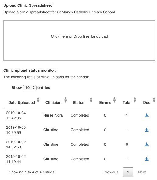 You can download the clinic spreadsheet for each school/ clinic session. This is done by opening the clinic spreadsheet tab from within the school.
