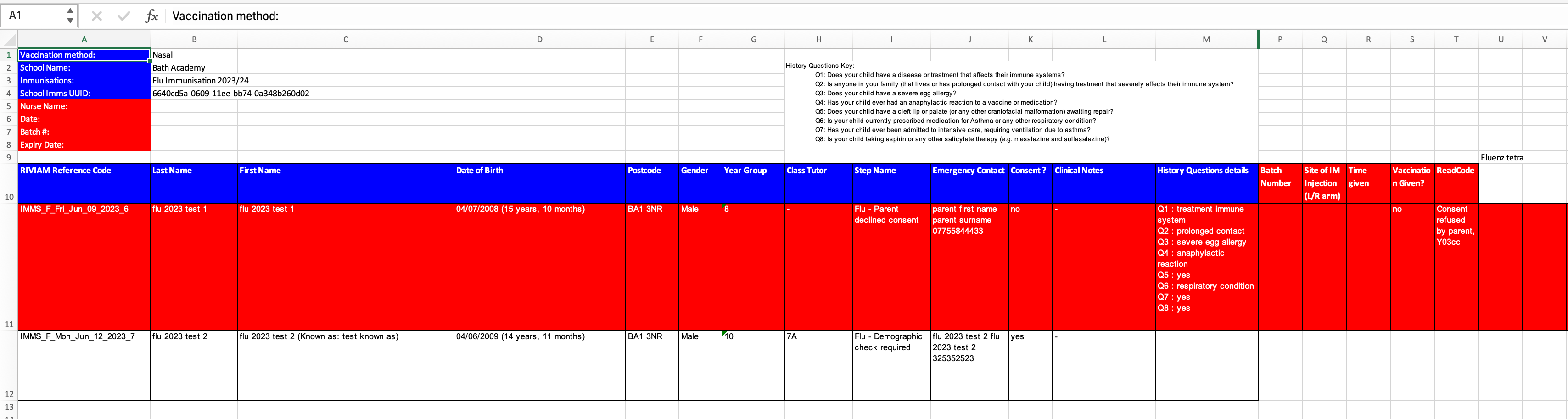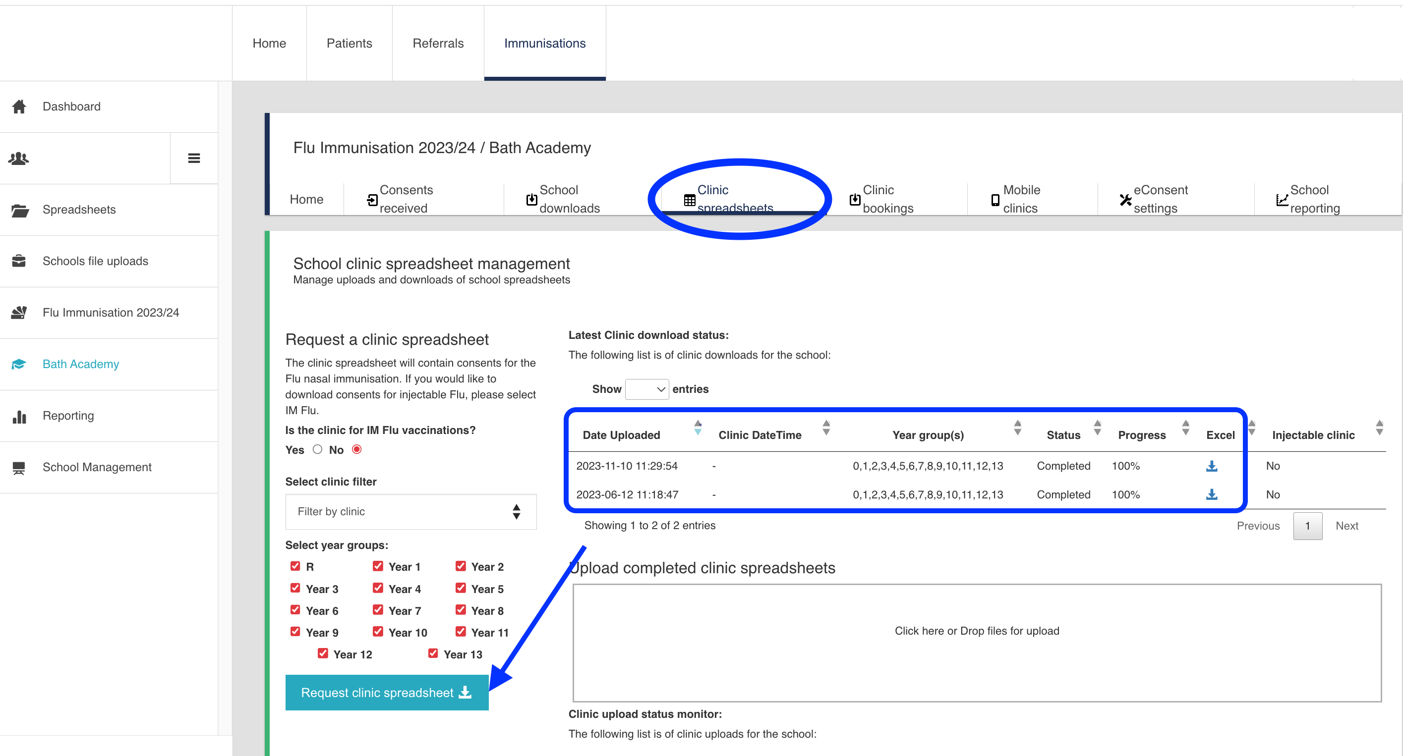 Choose the year groups you would like to include in the school/clinic session, and then select Request Clinic spreadsheet.
