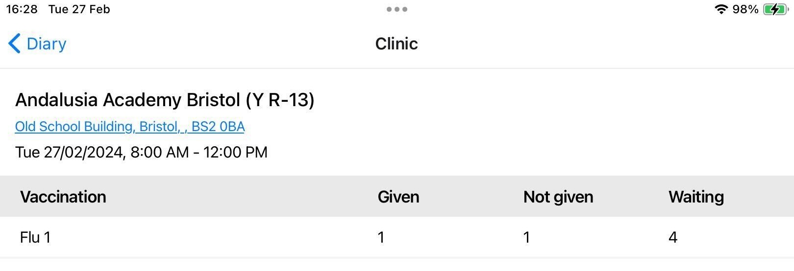 The School Details section shows the name of the school and its address. The address is selectable and will cause Apple Maps to load. The date and times of the immunisation are also shown.