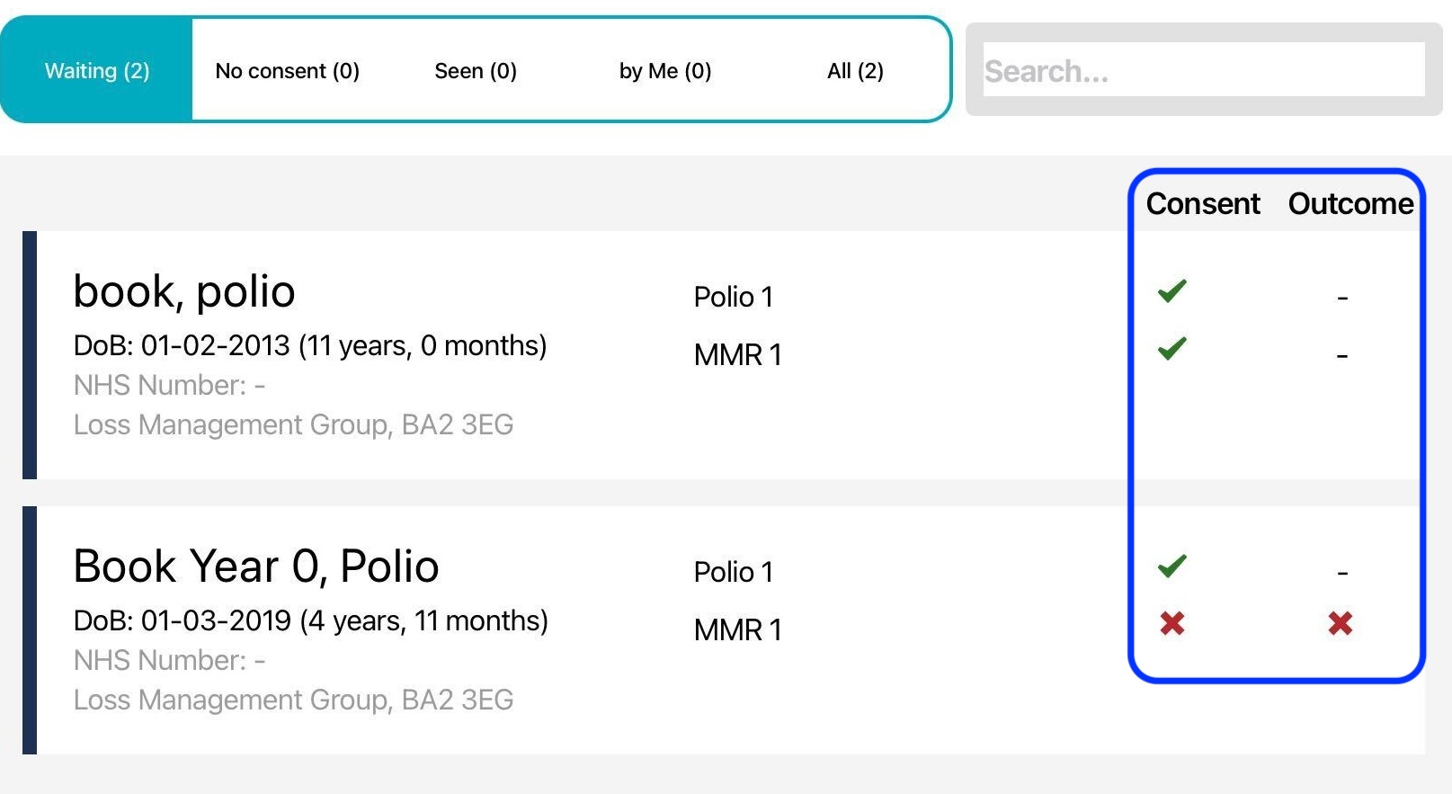 The outcome status shows if the patient has been immunised or not. A tick is shown if the vaccination has been ‘Given’ and a cross if it has been ‘Not given.