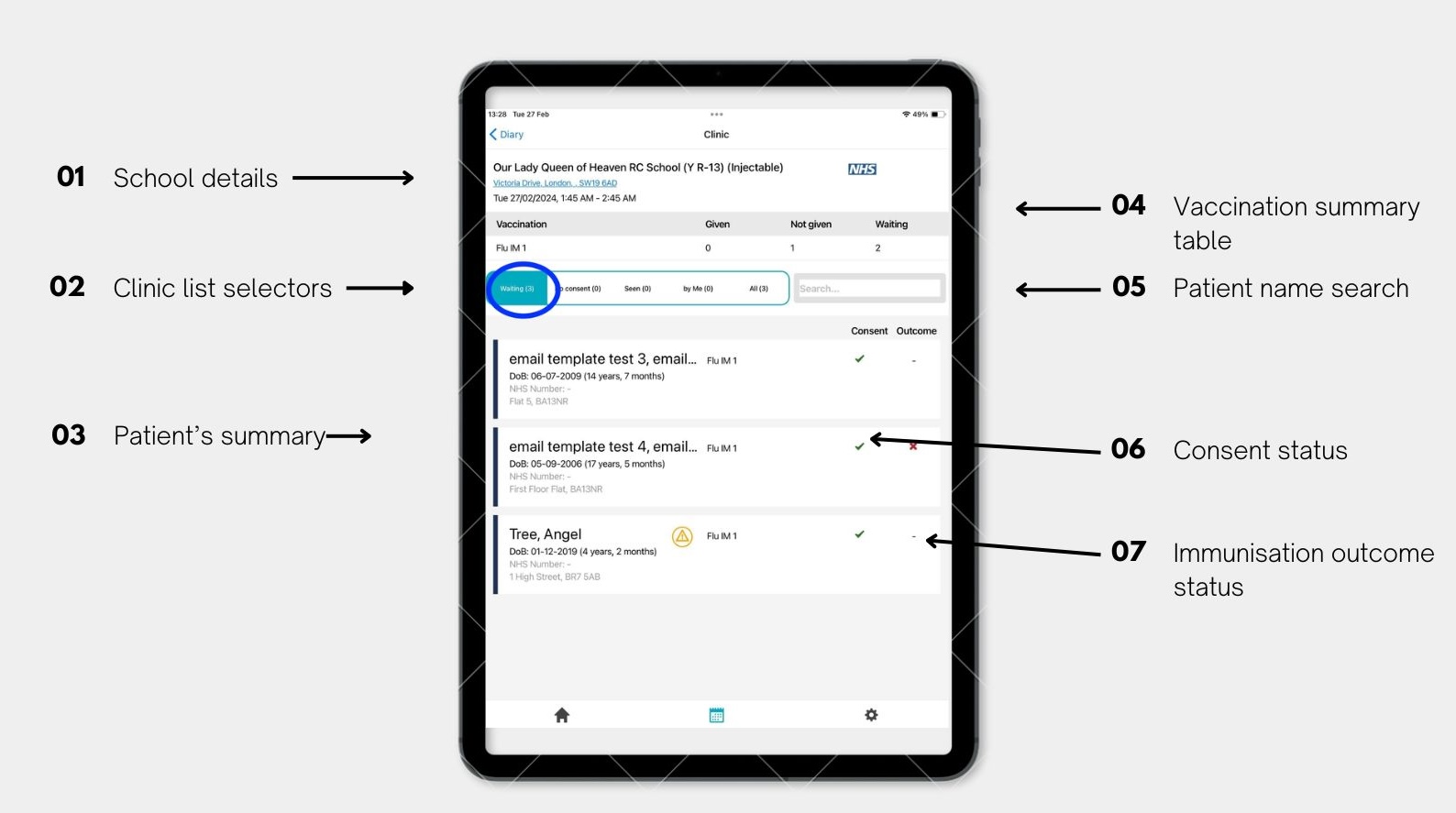 Click on the clinic (from the Home Page or Diary view) and you will be taken to the Clinic Page. At the top of this page, you will see the school’s address and clinic schedule time. This page provides a really easy way of seeing the status of the clinic and allows the clinician to search for patients.