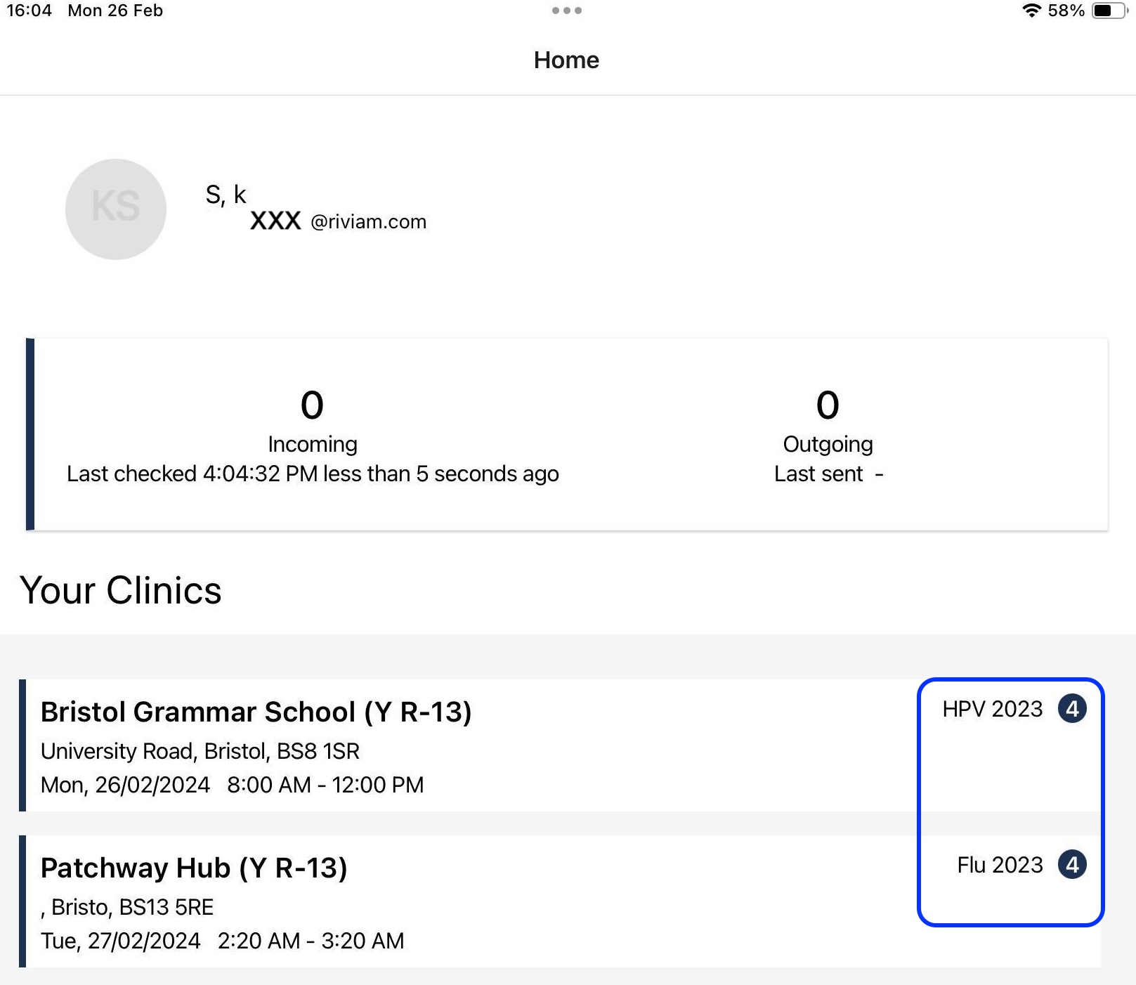If the user has been assigned to a school/clinic session, this will be listed under Your Clinics.
