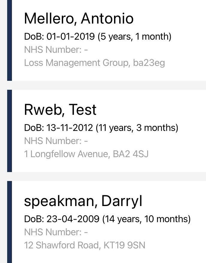 You will see a list of all received consents for children showing the child’s first name, last name, date of birth and age (in years and months), NHS number and summary address.
