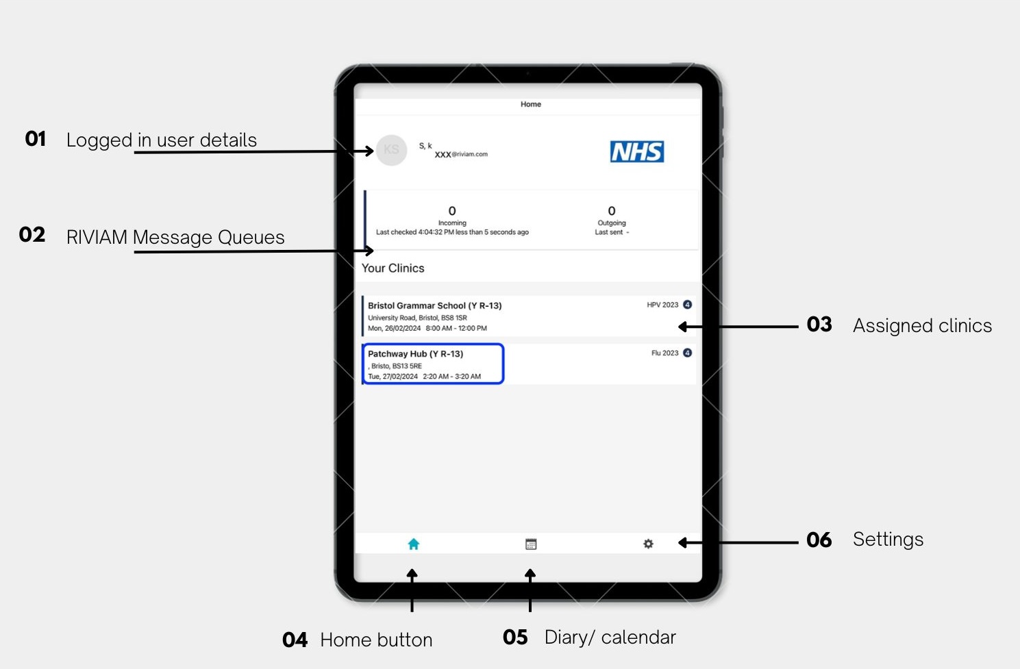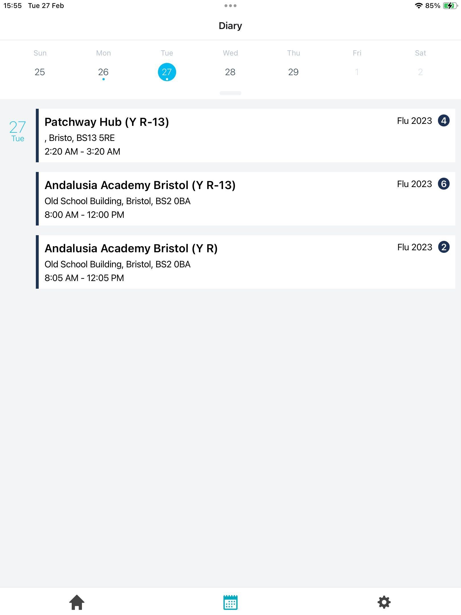 All clinics you have been assigned for that day will appear on the Home Page, displaying the name of the school, with the address, date and time of the clinic.