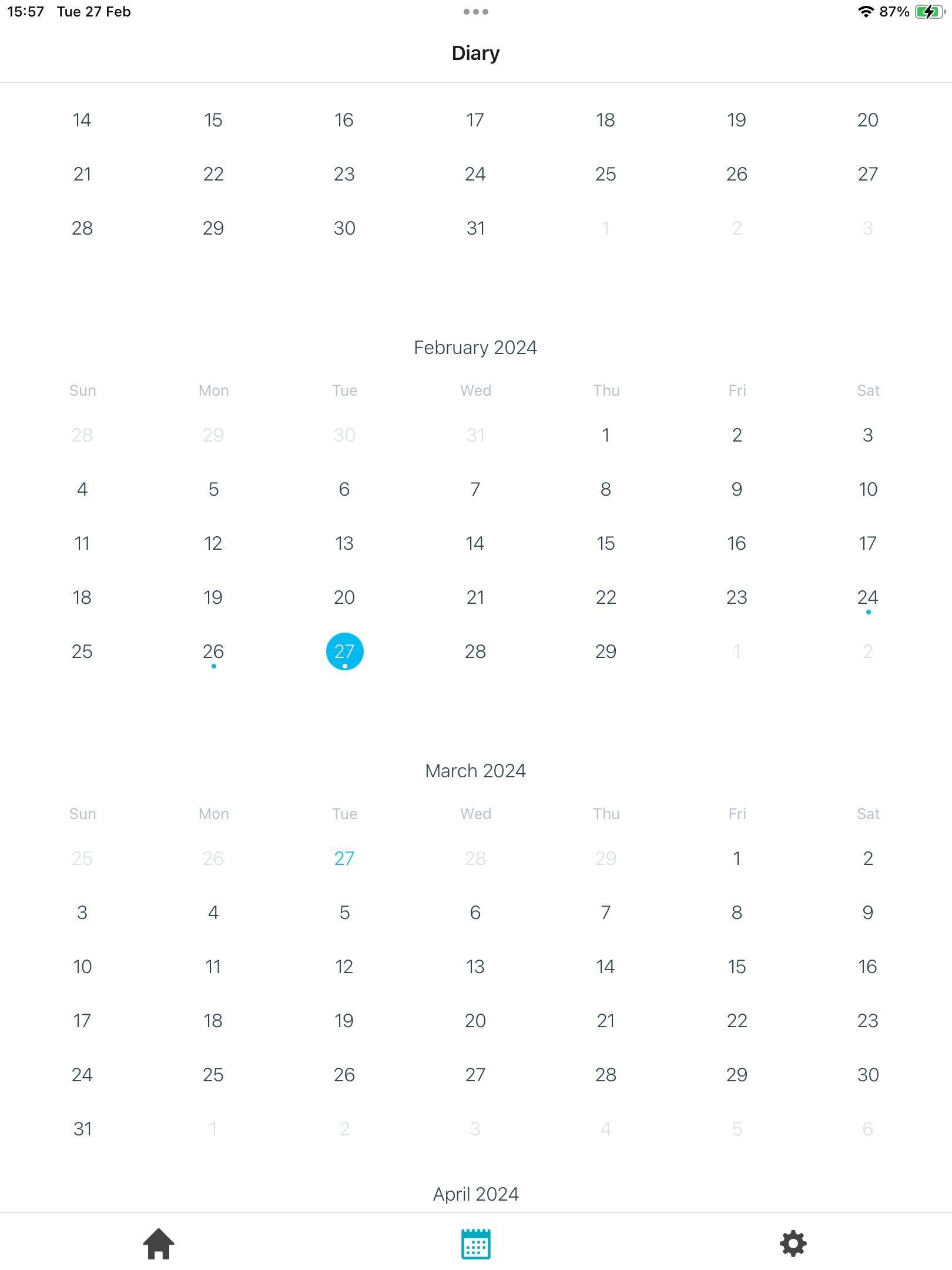 At the bottom of the page is a set of icons that are always visible and allow the user to navigate to the Home Page, Diary or Settings view.