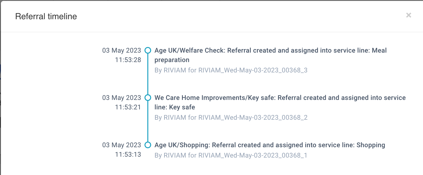 The timeline shows a history of the status update events for a user to review. When a partner organisation changes the status of the referral, they include a status reason which is included in the timeline. Also, if a user creates a timeline event ...