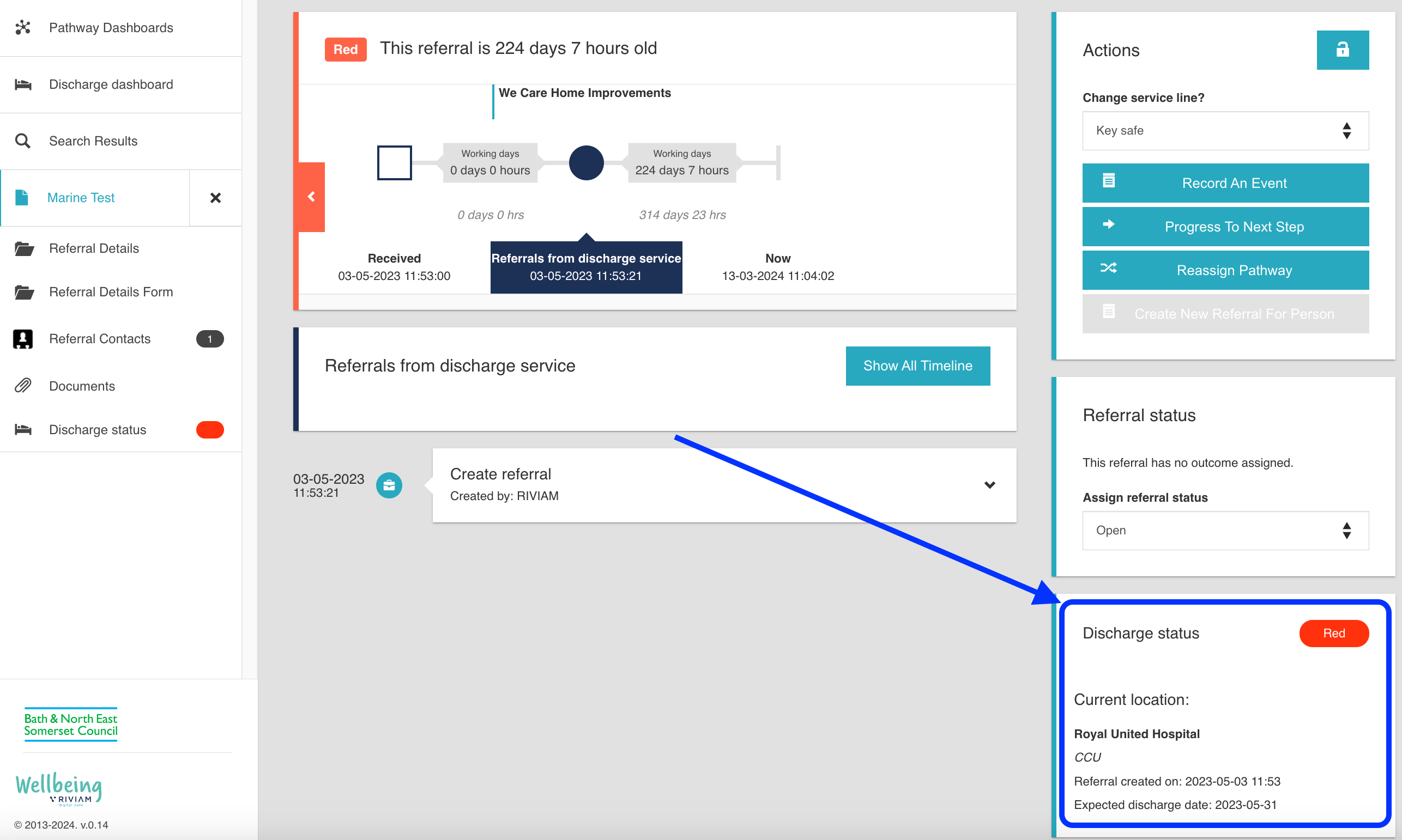 If a referral has been received from the Discharge Service, the user will see additional functionality added to the Referral Navigator. It gives the user an overview of the person’s current location, admission date and expected discharge date.