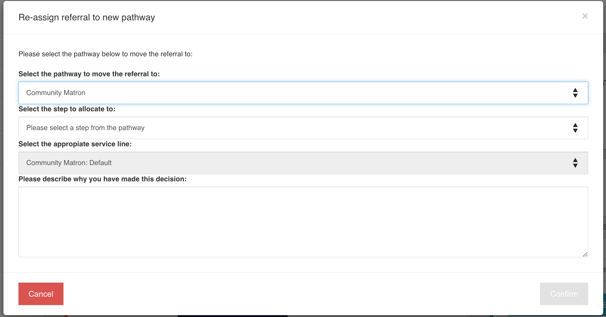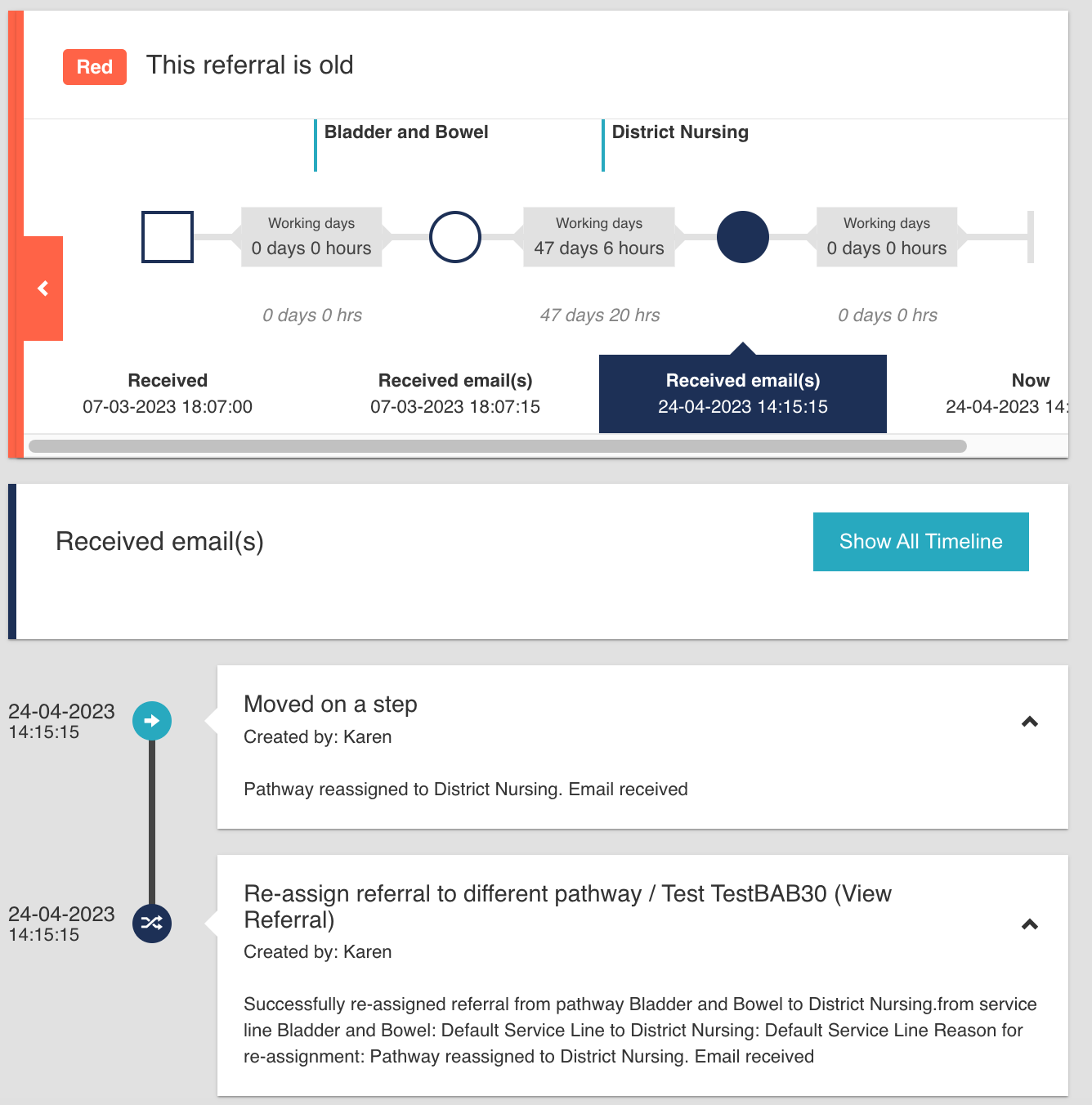 Once a referral has been reassigned, it will appear in the pathway centre and referral dashboard of the new pathway. A timeline event, including the date, time, by whom the referral was re-assigned, and which pathway it came from, will also be visible in the patient record.