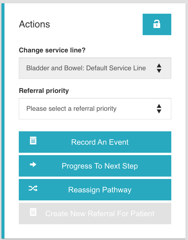 If you decide that a referral needs to be reassigned to a different pathway (or you are reassigning referrals from the Unallocated Referrals pathway), you can do this by clicking the “Reassign Pathway” button on the right-hand side of the referral dashboard (under “Actions”):
