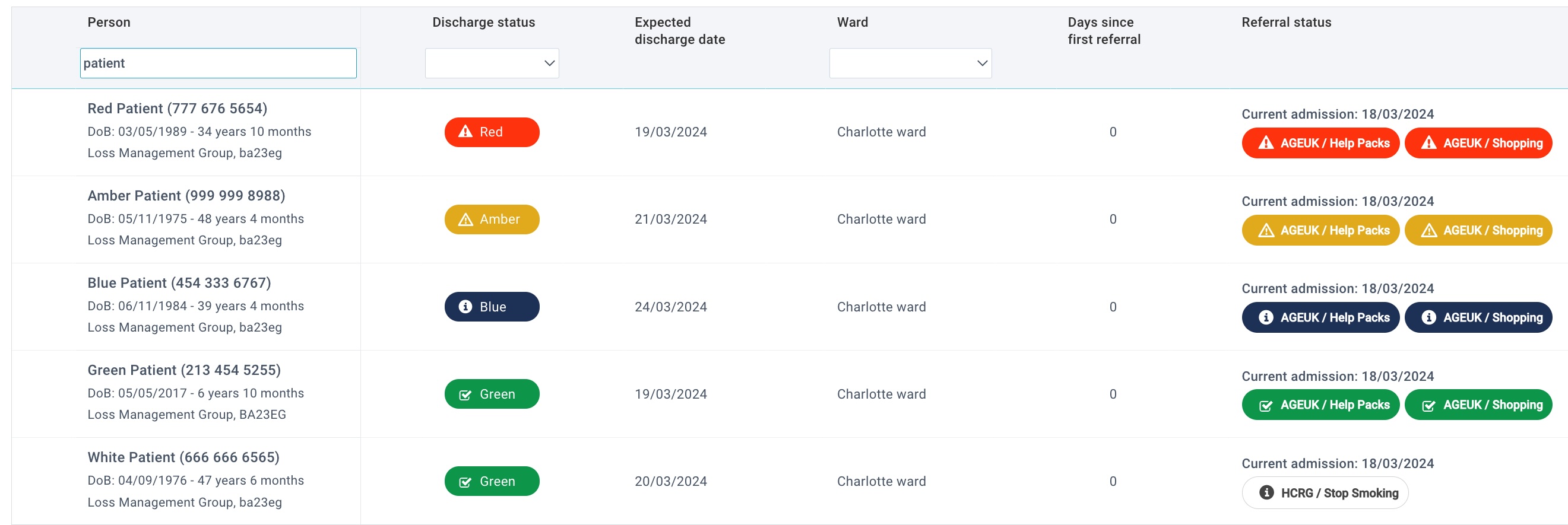 The discharge dashboard calculates an overall Discharge RAG status for each person. The Discharge RAG status is colour-coded Blue, Red, Amber, and Green. There is a filter box at the top of the dashboard column so users can select to view each ...