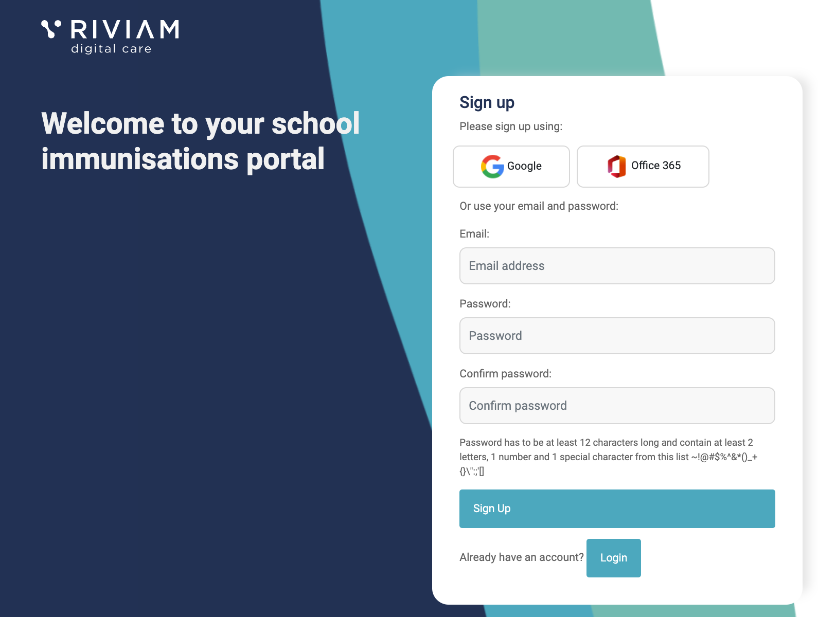Please note: Should you have any difficulties with the sign-up process, contact the Immunisations Team to check your login credentials. Should further technical support be required, they can direct you to the RIVIAM Support Team support@riviam.com, and our team will be happy to assist you.