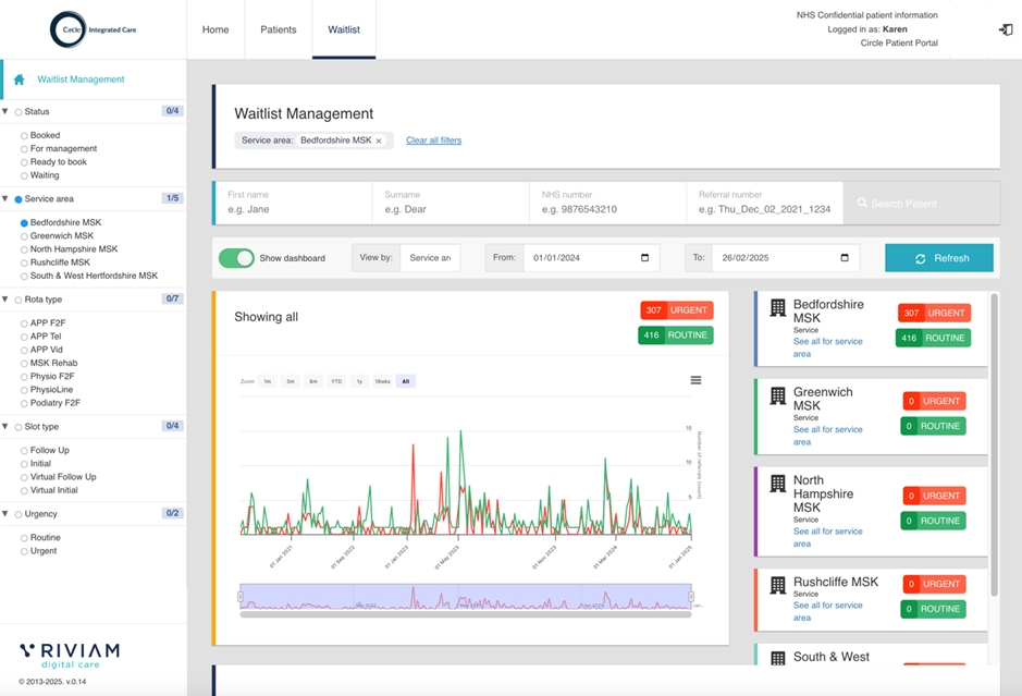 The default view for the central graph presents the complete list of appointments; however, clicking on any ‘see all’ links in status cards on the right-hand side will update the central graph. Alternatively, you can also select the green routine or red urgent flags to update the central graph.