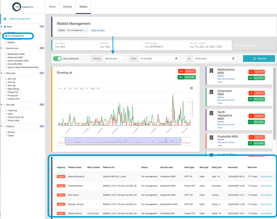 The waitlist service area dashboard will display information on each referral's service area, such as North Hampshire, South, and West Hertfordshire.