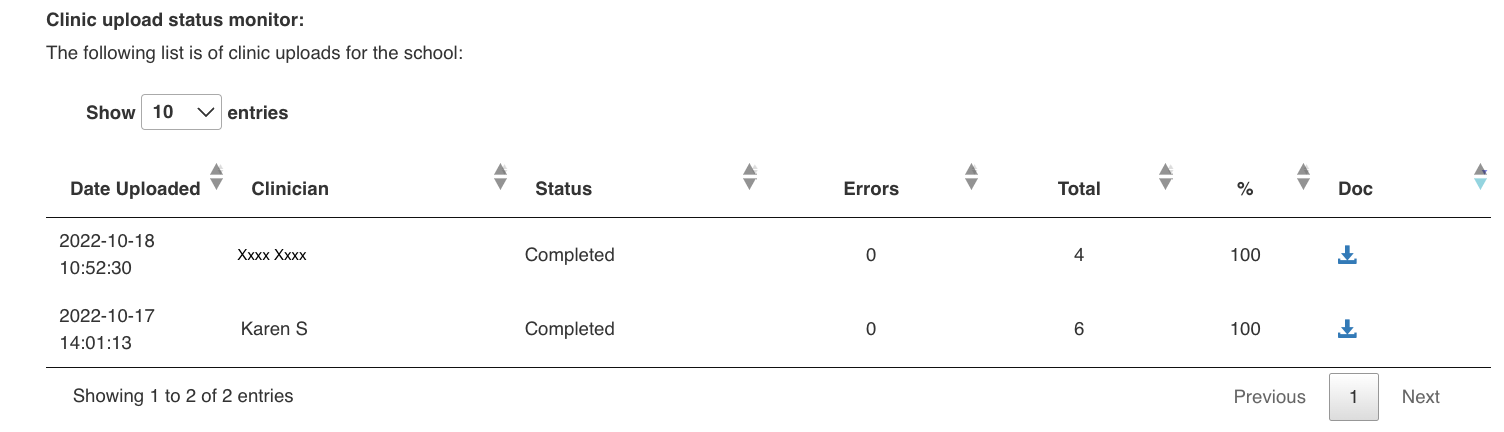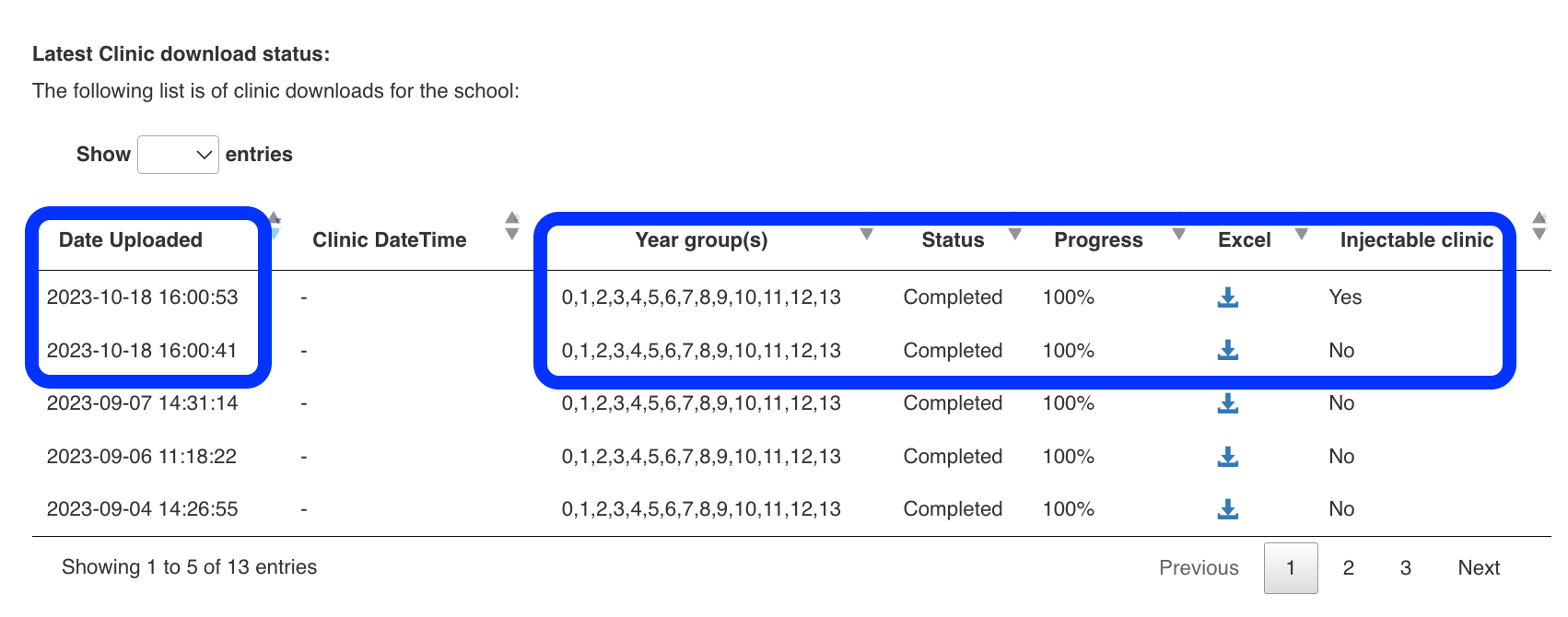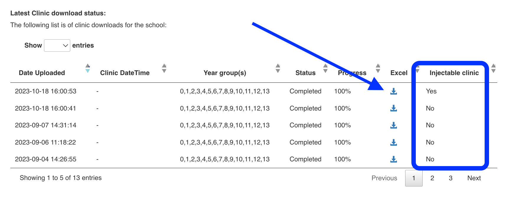You can see the date and time the spreadsheet was requested, the date and time of the clinic, the year groups, status, progress and the download button.