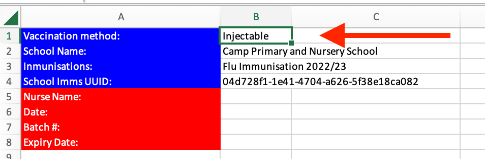 - At the top of the clinic spreadsheet, you will see the vaccination method, either Injectable or Nasal, depending on the spreadsheet you requested.