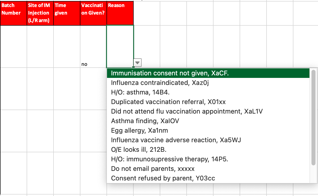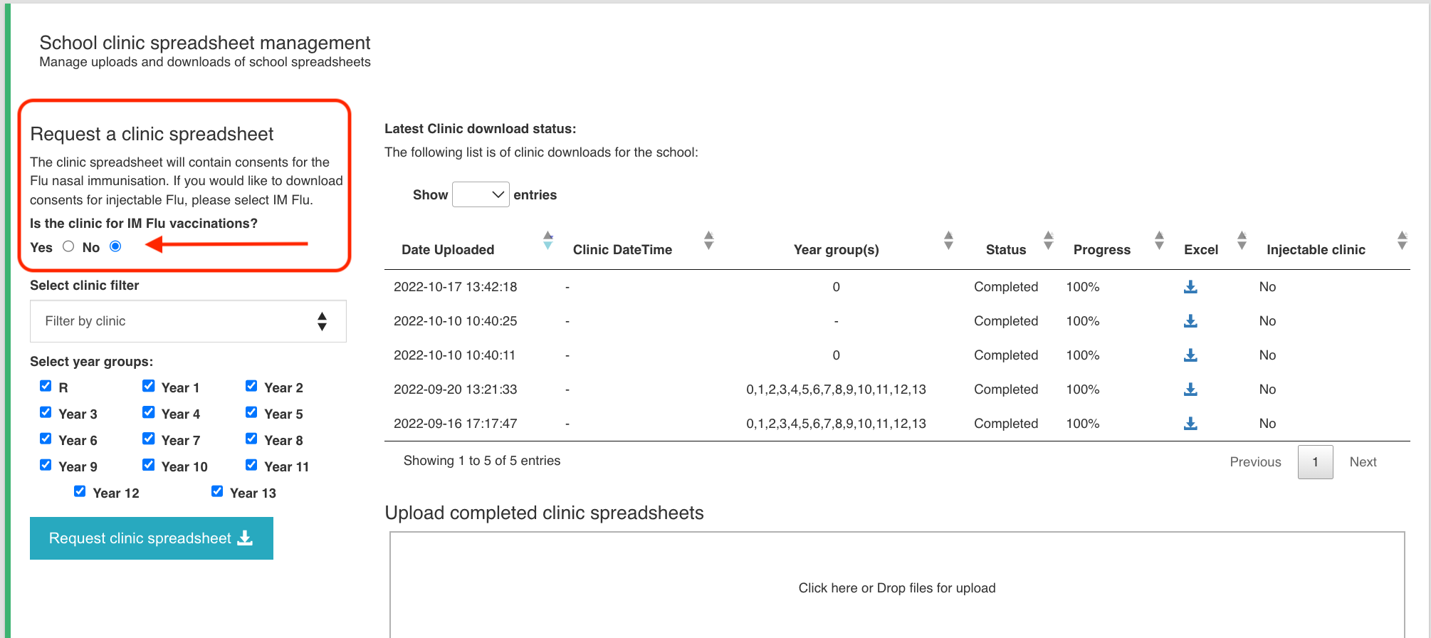 The clinic spreadsheet will contain consents for the Flu nasal immunisation. If you would like to download consents for the injectable Flu, please select IM Flu.