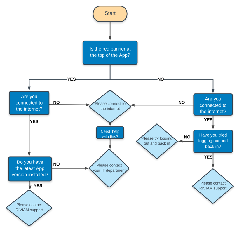 The following flowchart shows the steps to follow before raising a support request with RIVIAM or your IT department. To note, the RIVIAM support email address is support@riviam.com.