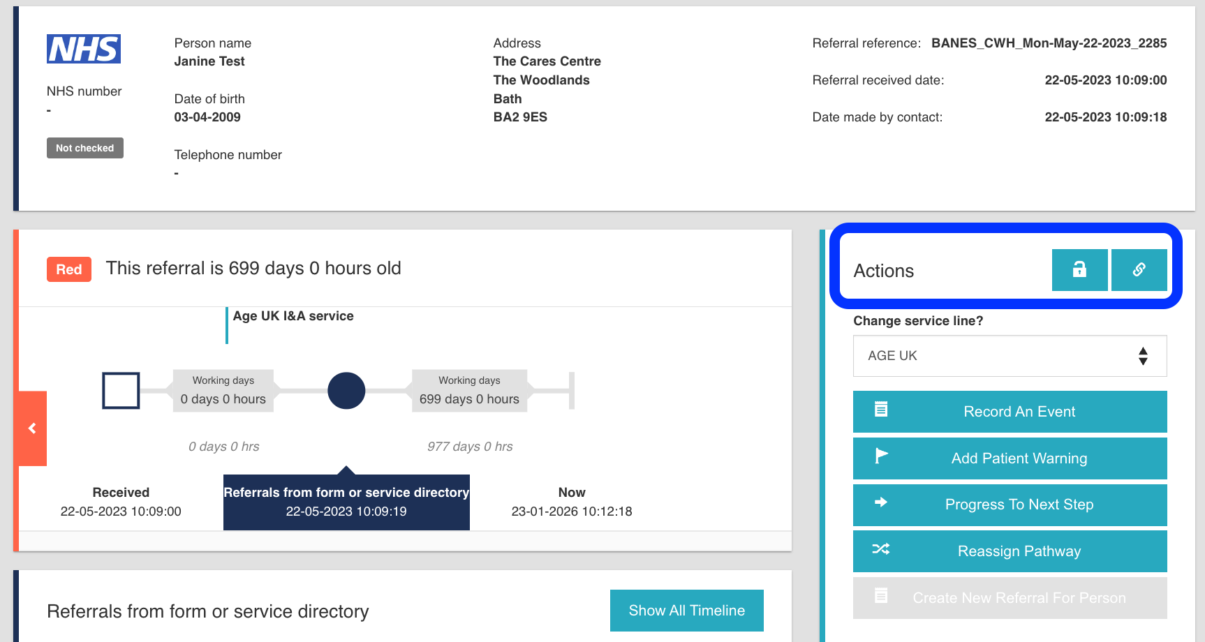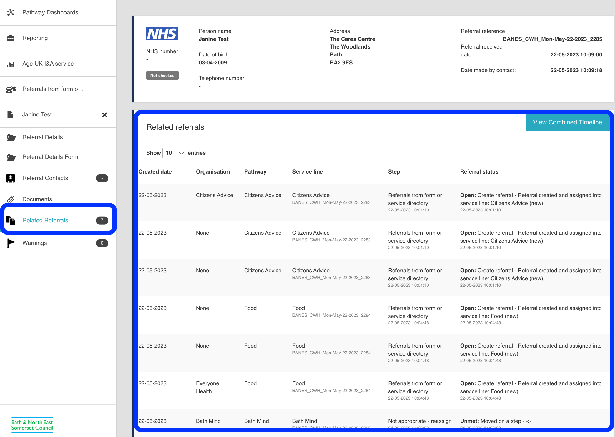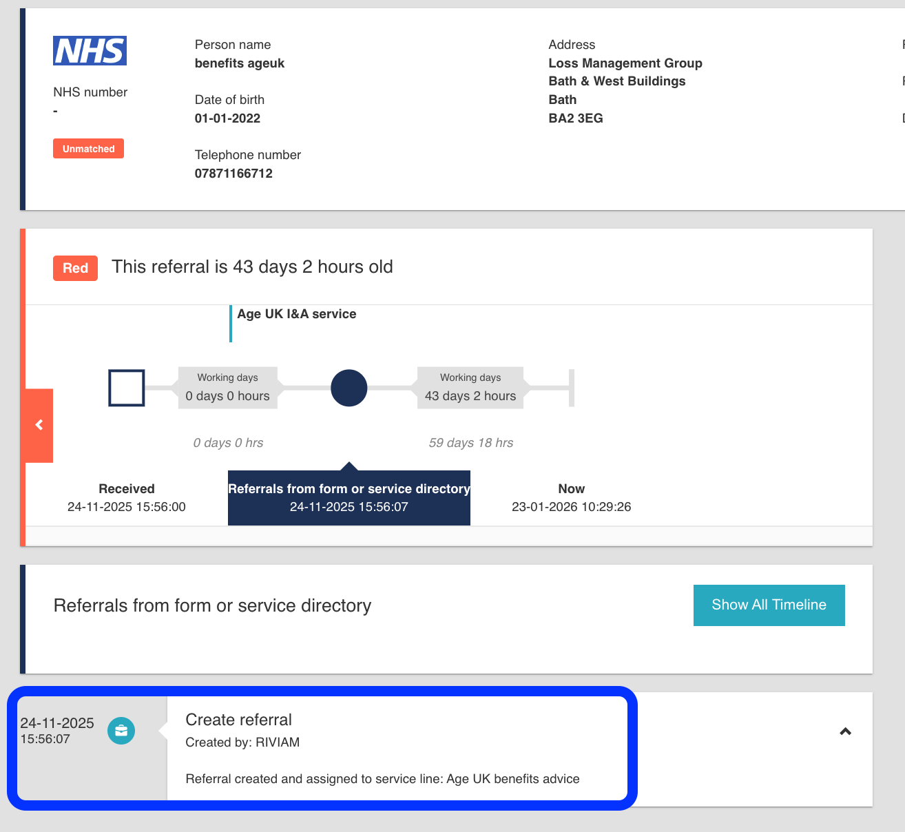 By selecting this section, the user can see the timeline of events. This can include new referrals created, the referral being progressed to the next step and any activities recorded during the management of the referral. By selecting the arrow on the timeline event, the user can see the additional notes added by referrers.
